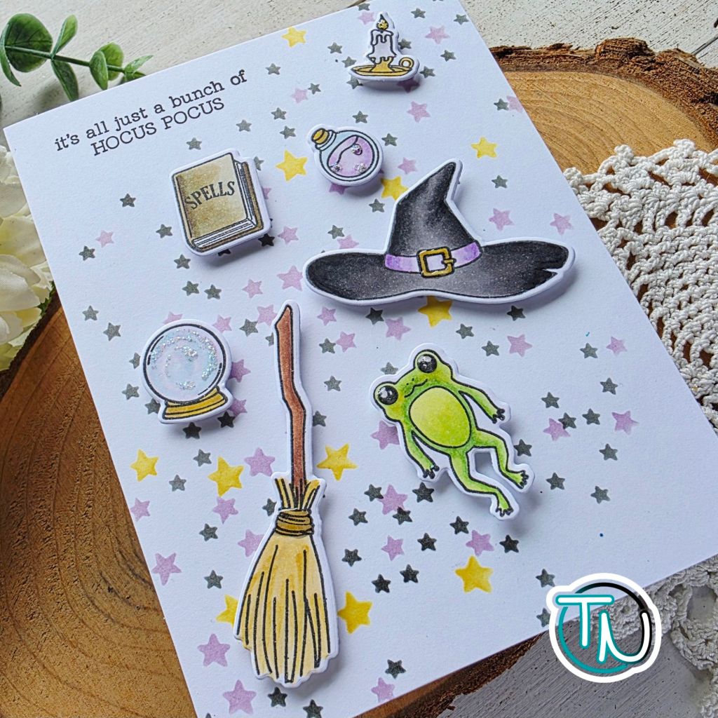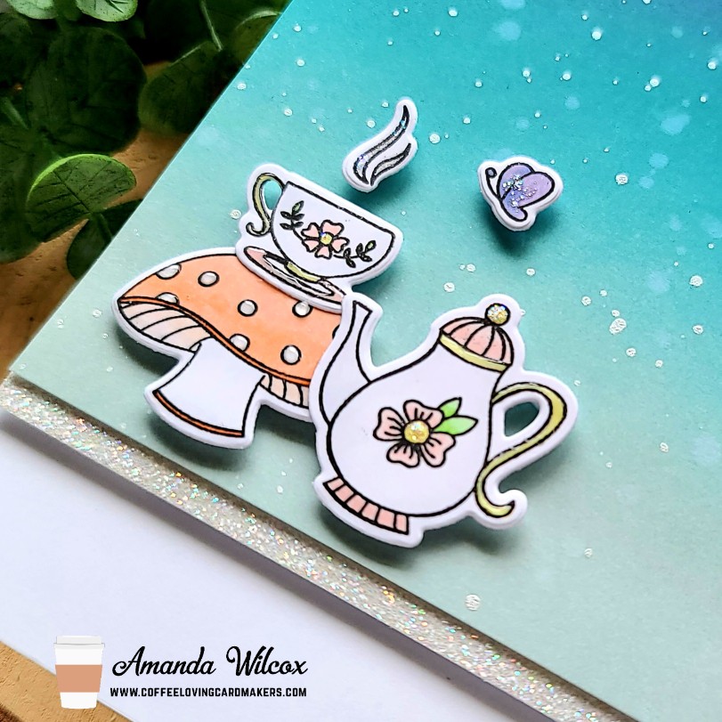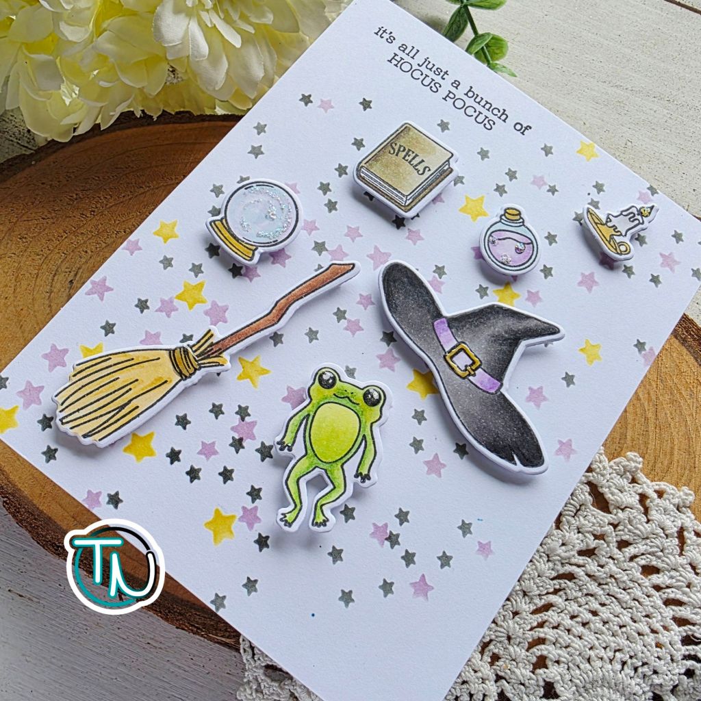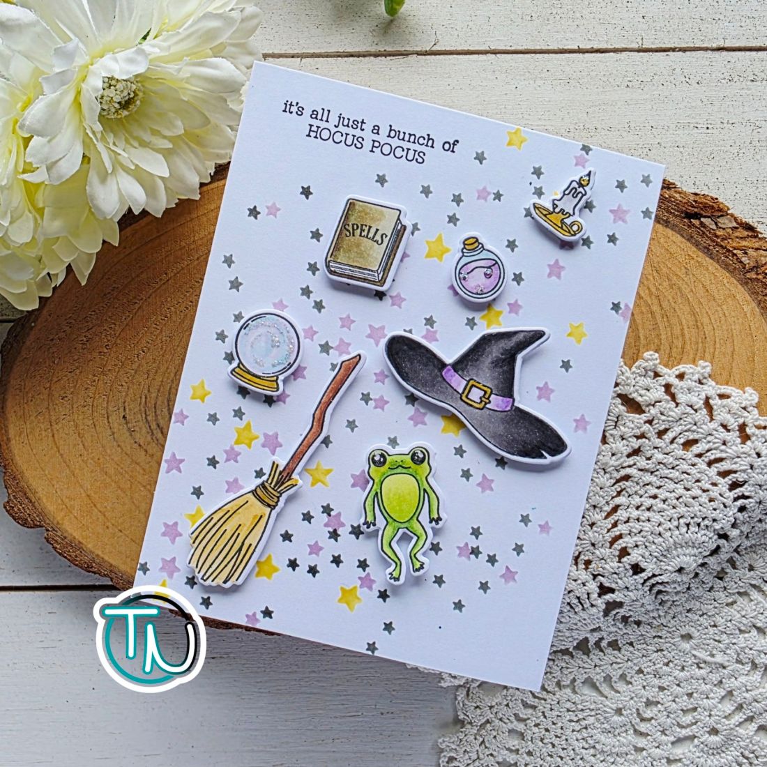For my second card, I went darker on my color palette and finished things off with some Astro Paste for the beautiful gold glitter. This library belongs in a castle somewhere, I’m sure of it!