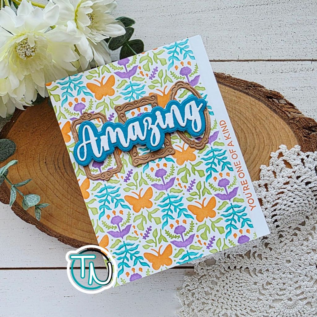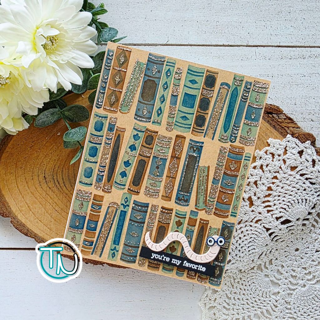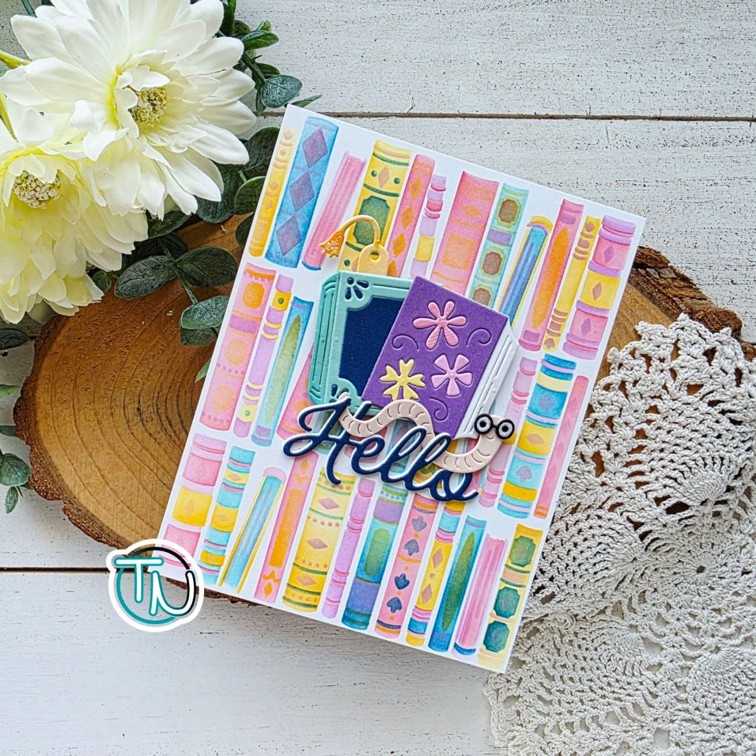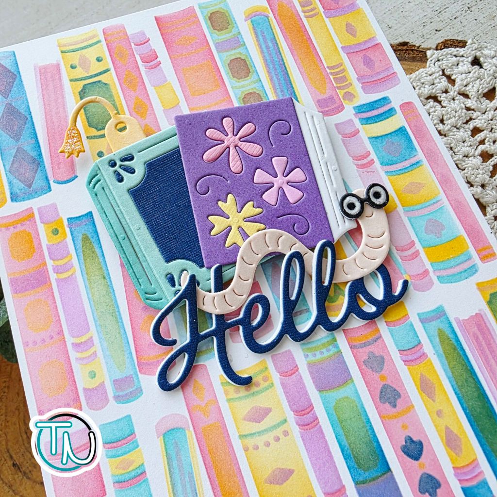 My first try at the layering stencil, I went with a ton of bright, happy colors just to play with it. It was so fun and I love how it turned out! Then I grabbed the die of the month set and couldn’t wait to build the sweet book worm, along with both styles of books included.