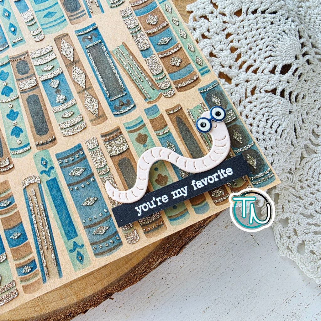 I added the books with foam squares, then the worm and sentiment below it with liquid glue and a foam square where needed. I finished things off here with glossy accents on the worm’s glasses because, who can resist that?!? Not me.