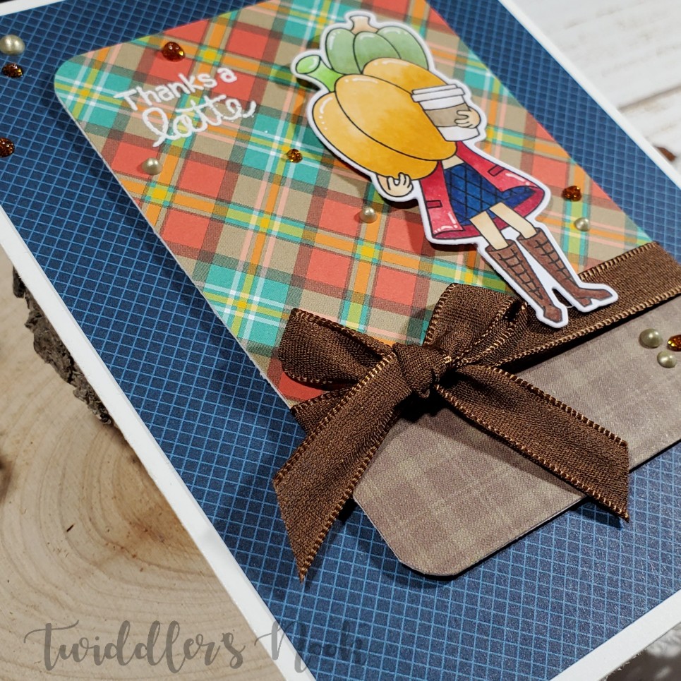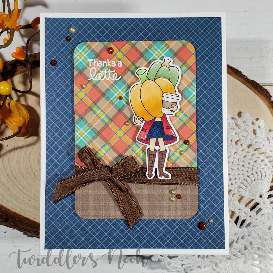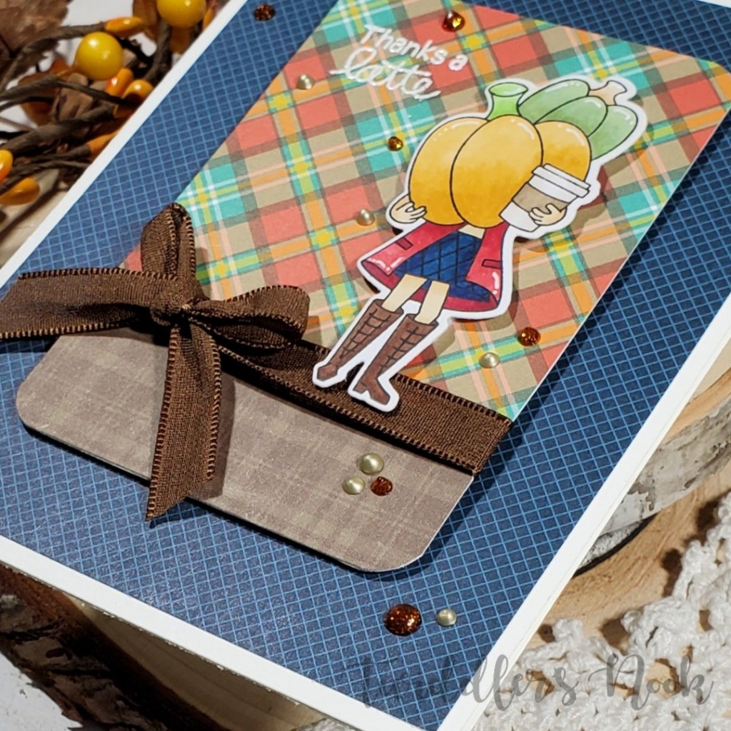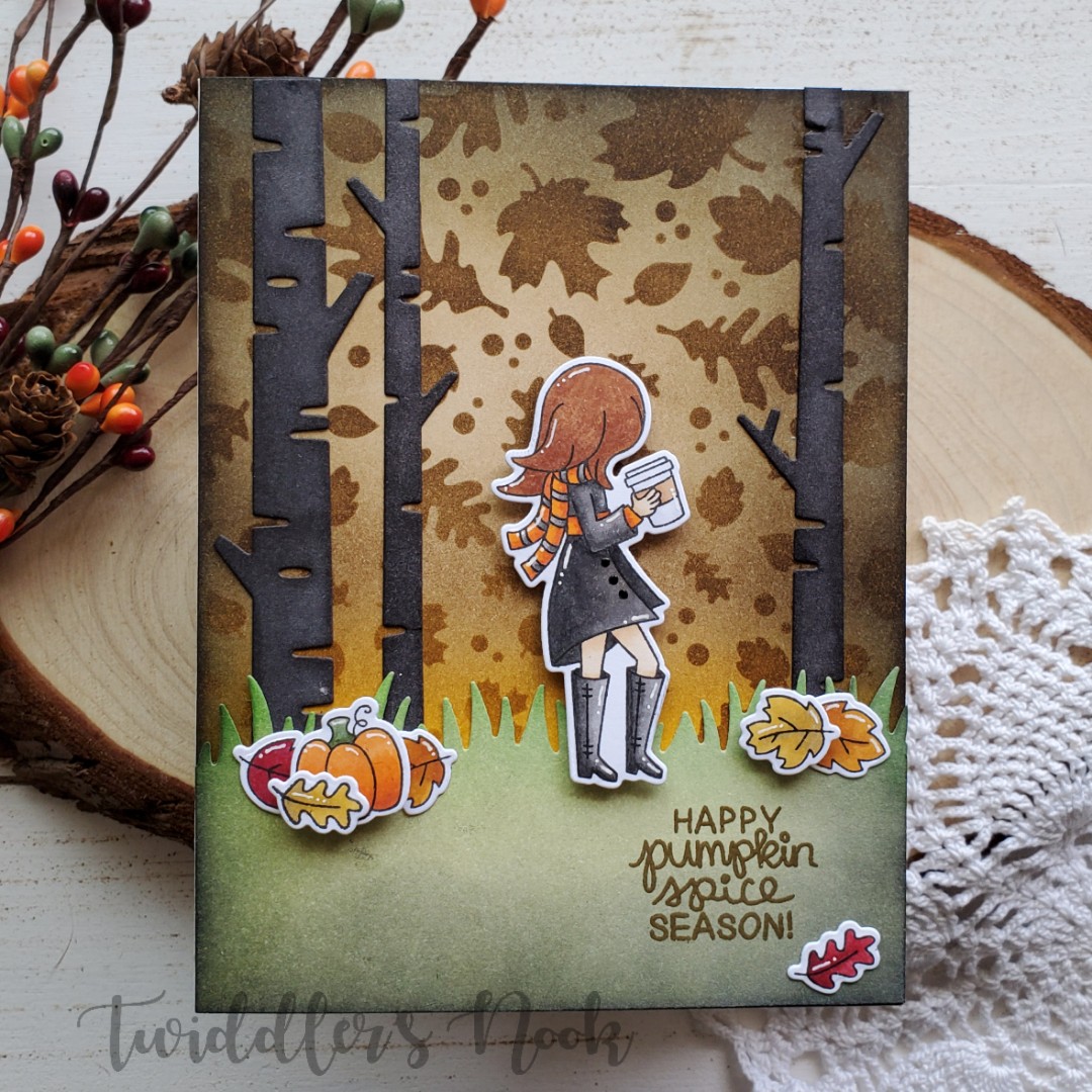 - I glued the leaves down creating a ground for my girl and popped her and the pumpkin up with foam squares. At this point I added my sentiment to the bottom corner as well.
