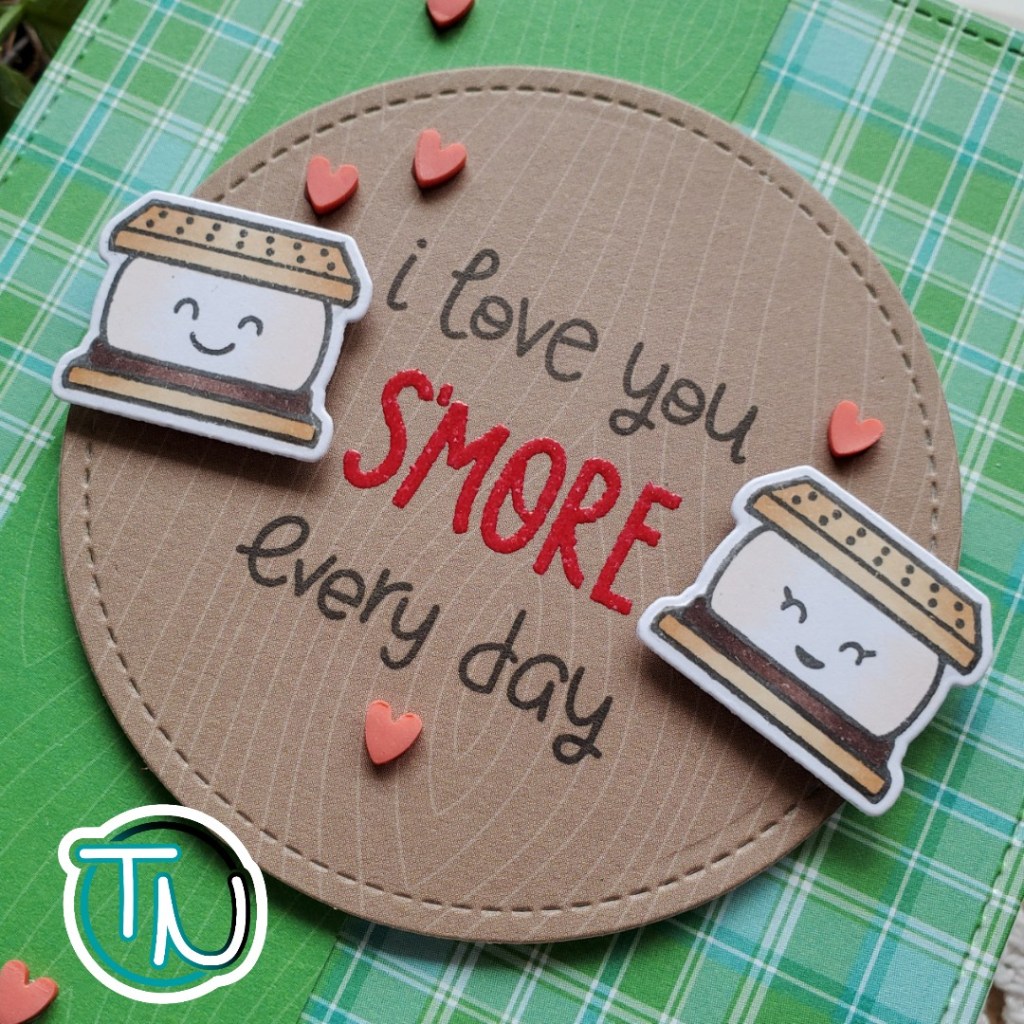 I love this Shark Hugs stamp set by Avery Elle! It comes with a variety of things you can fit in the shark’s fins but I decided to think outside the box a bit and found a coffee mug the perfect size! This die set can be tricky so I started by using the die made to cut the slits for his fins, then I stamped my image over that, lining up the fins with the cut marks. Then I colored him with my copics and cut him out. I snagged a mug from the Lawn Fawn Love You a Latte set, colored it up and die cut it too. I used liquid glue to adhere the mug in the shark’s fin.