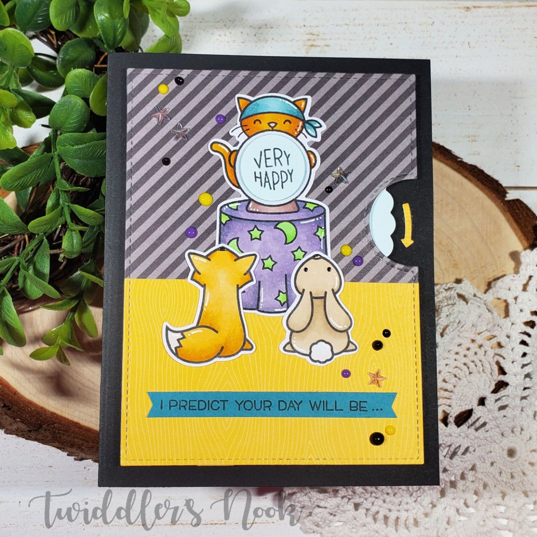 For the topper, I die cut 2 Lawn Fawn stitched circles (next to the smallest) for each one and stamped a star background stamp in yellow ink for a little interest. I stamped, colored and die cut my bunnies from Critters in Costume. Then stamped, heat embossed and die cut the word bubble from the same set. The bunny and speech bubble are both popped up with foam squares. Finally, to seal them off I used Scrappy Tape on the back of both circles so they are adhered to each other and to the top of the bag.