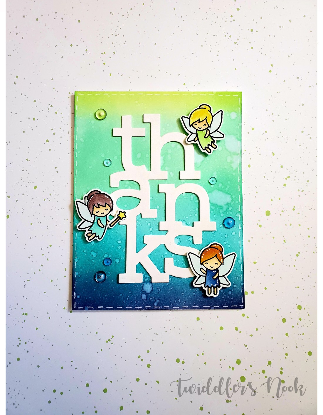 I used my Wink of Stella clear glitter brush to add shimmer to the fairies’ wings and the entire thanks die cut. Then I added these great bubbles from Honey Bee Stamps around the card and finished off the front with some white gel pen accents.