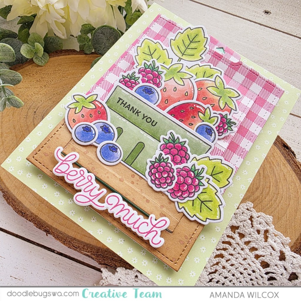 I carefully used an acrylic block to stamp the smaller portion of my sentiment on the berry basket and then stamped and die cut the other portion to pop up at the bottom of the scene. Finally, I added white gel pen highlights all over the images.
