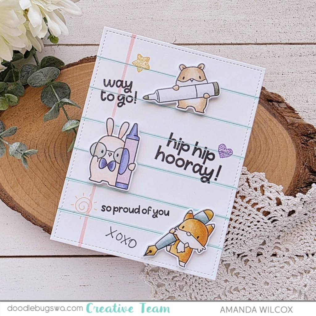 Next I pulled sentiments from the Mama Elephant Way To Go stamp set and added them around the critters. For finishing touches I added glossy accents to critter noses, glasses and parts of the pens.