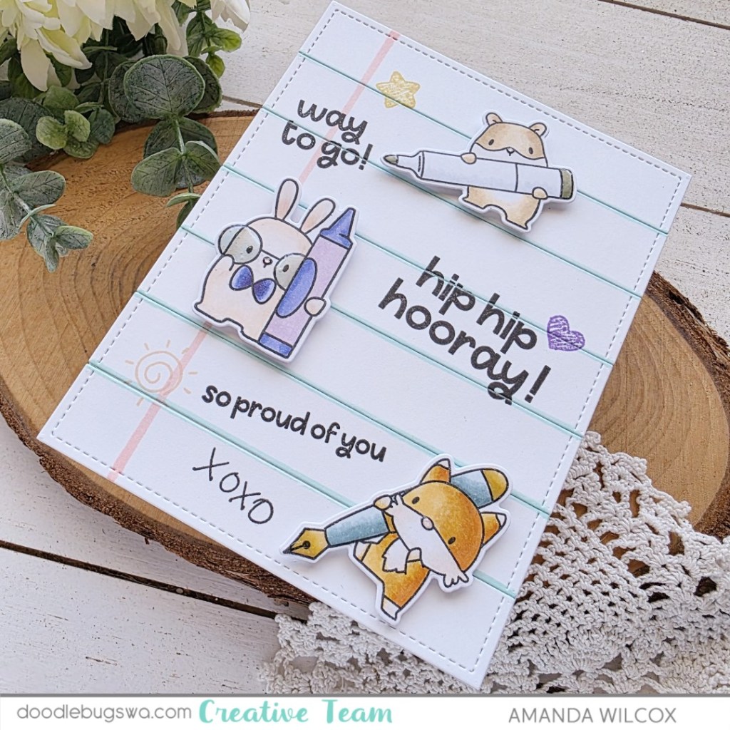After coloring and die cutting the first two critters, I realized that I needed a third. So I remedied that and set them aside to work on my fun background idea…faux notebook paper with the Lawn Fawn Simple Stripes Portrait die! I cut the backdrop from white cardstock and glued it to a card base. Then I used a ruler to keep my lines straight and BG11 and R20 copic markers to add the notebook lines.