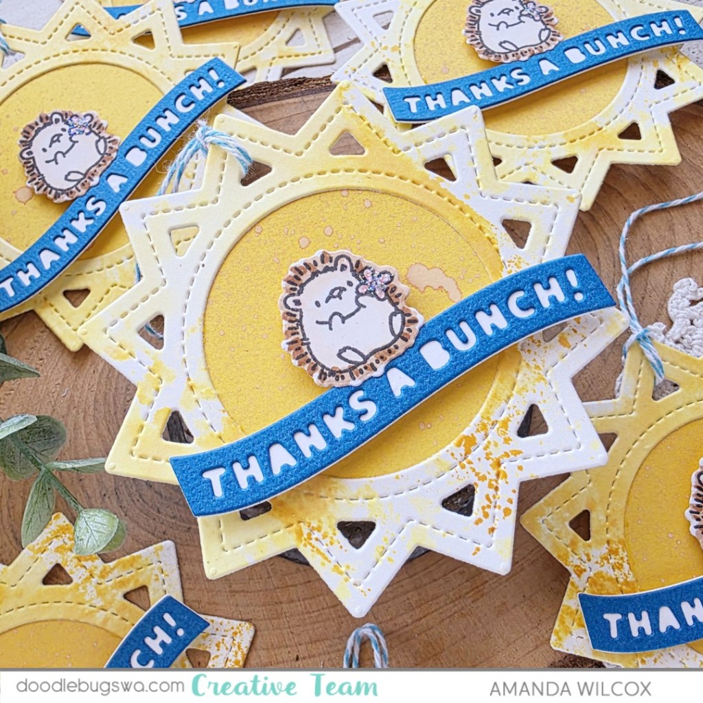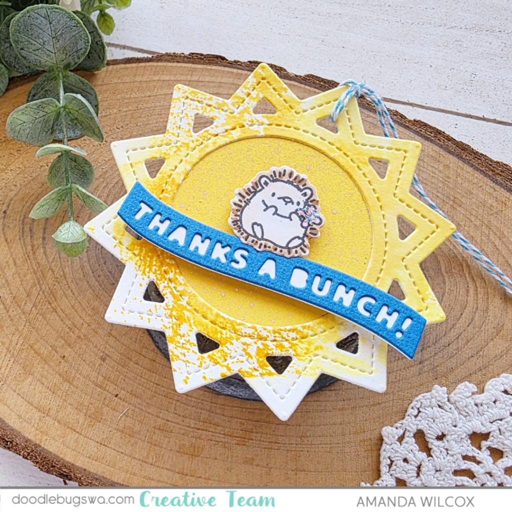 Products used today: Mama Elephant Banner Greetings dies Mama Elephant Little Agenda Hedgehogs stamps and dies Lawn Fawn Stitched Sun Frame dies Waffle Flower Nesting Circles dies Foam squares and strips Liquid glue Lawn Fawn sunflower and carrot inks (ink smooshing) Distress Oxide Spray – mustard seed Stickles – stardust