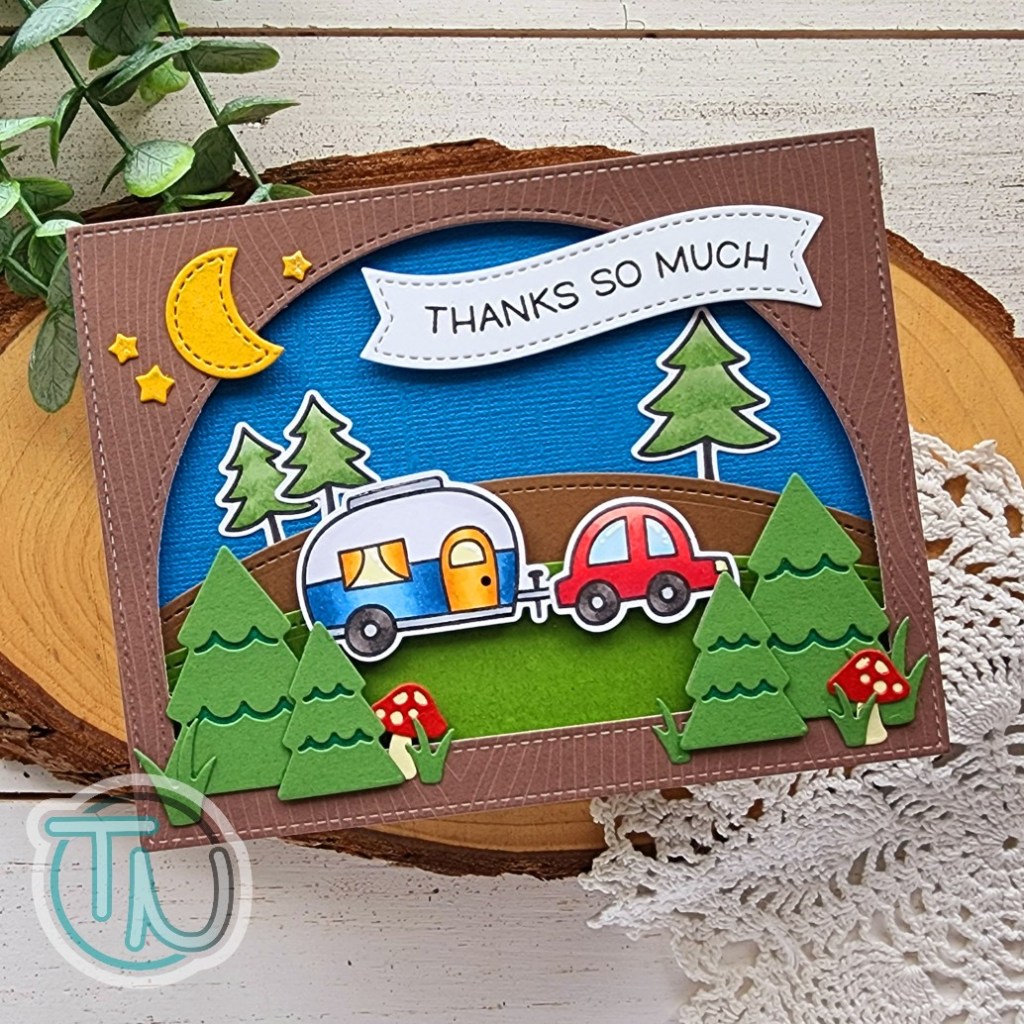 Finally, I added the trees to the background with liquid glue, popped up the trailer and car with foam squares and also decided to add the moon and stars from the Forest Backdrop dies to the upper left corner. I finished the scene off with the same wavy banner on the upper right which balanced the design perfectly.