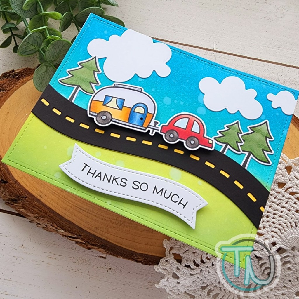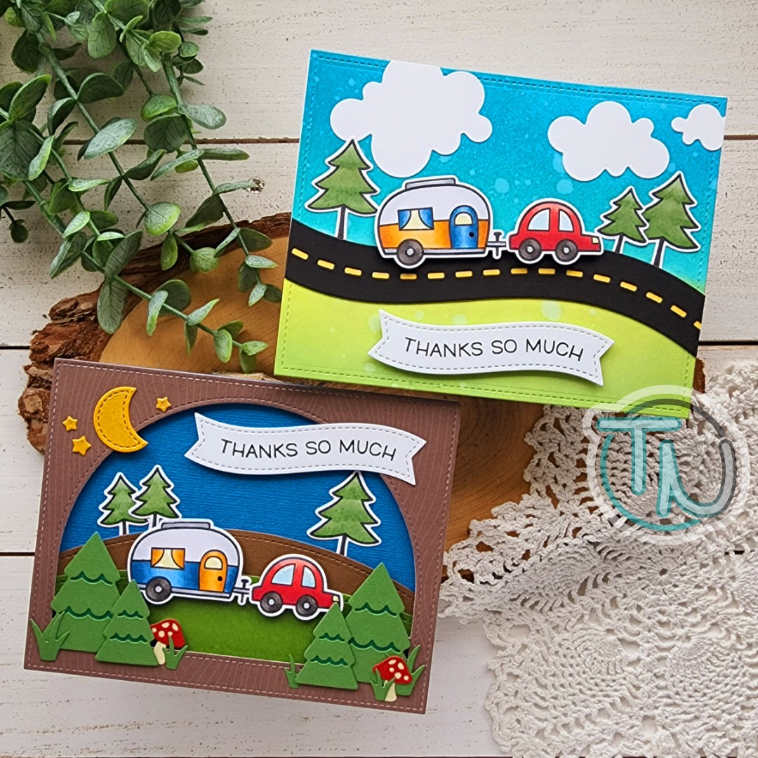Hi again! Today I’m popping in with a pair of thank you cards featuring an older Lawn Fawn set called Happy Trails. It’s a 3×4 set that I’ve had for ages and I always have so much fun creating with it. Today I’m making two thank you cards because we just bought our first travel trailer and I wanted to do something for a couple of guys at the dealership that were super amazing with us!