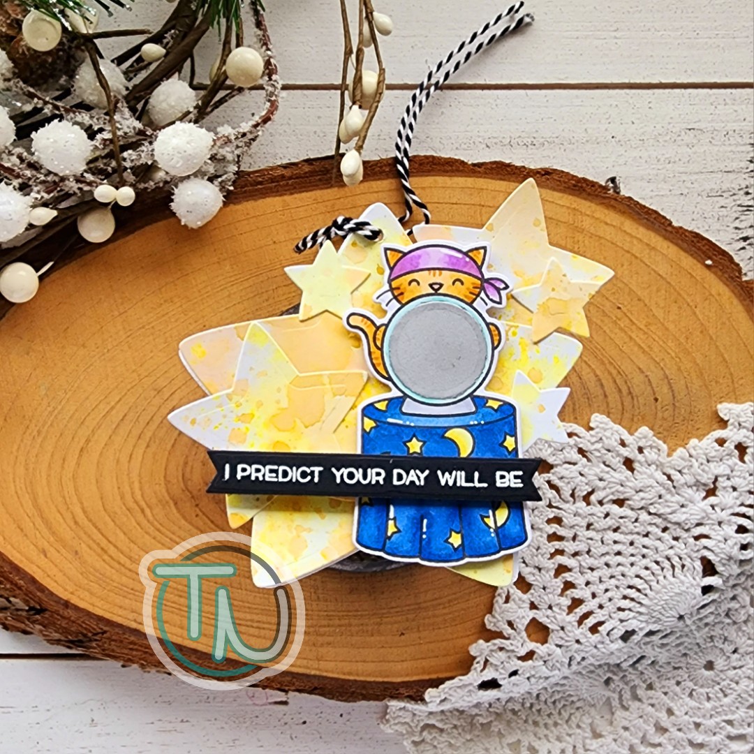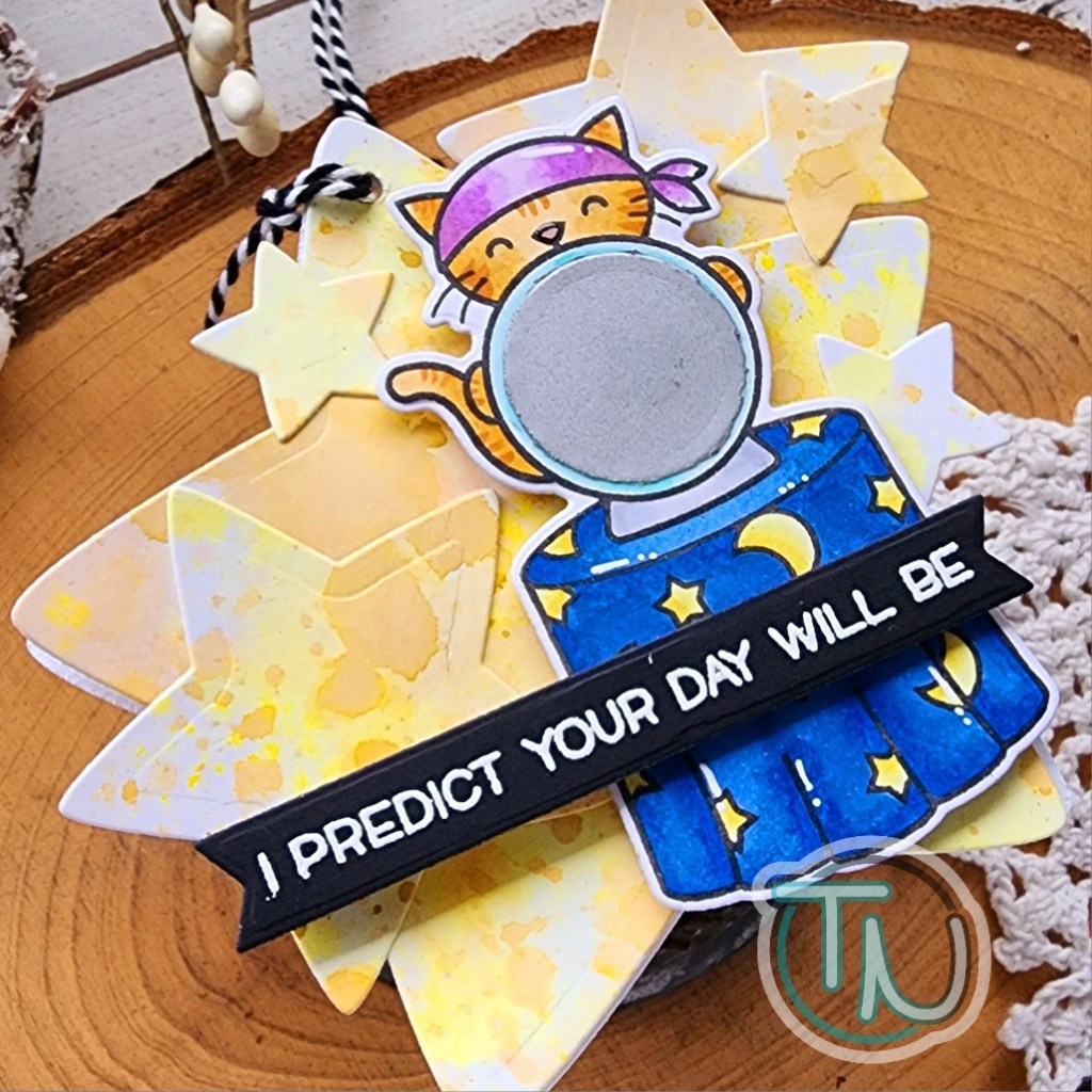 I started with the Lawn Fawn Fortune Teller Tabby set and stamped the kitty to color with my copic markers. After that, I used the coordinating die to cut her out. I stamped and heat embossed a sentiment, using a sentiment strip die to cut that out too.