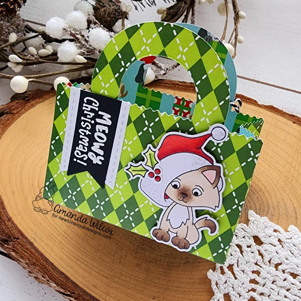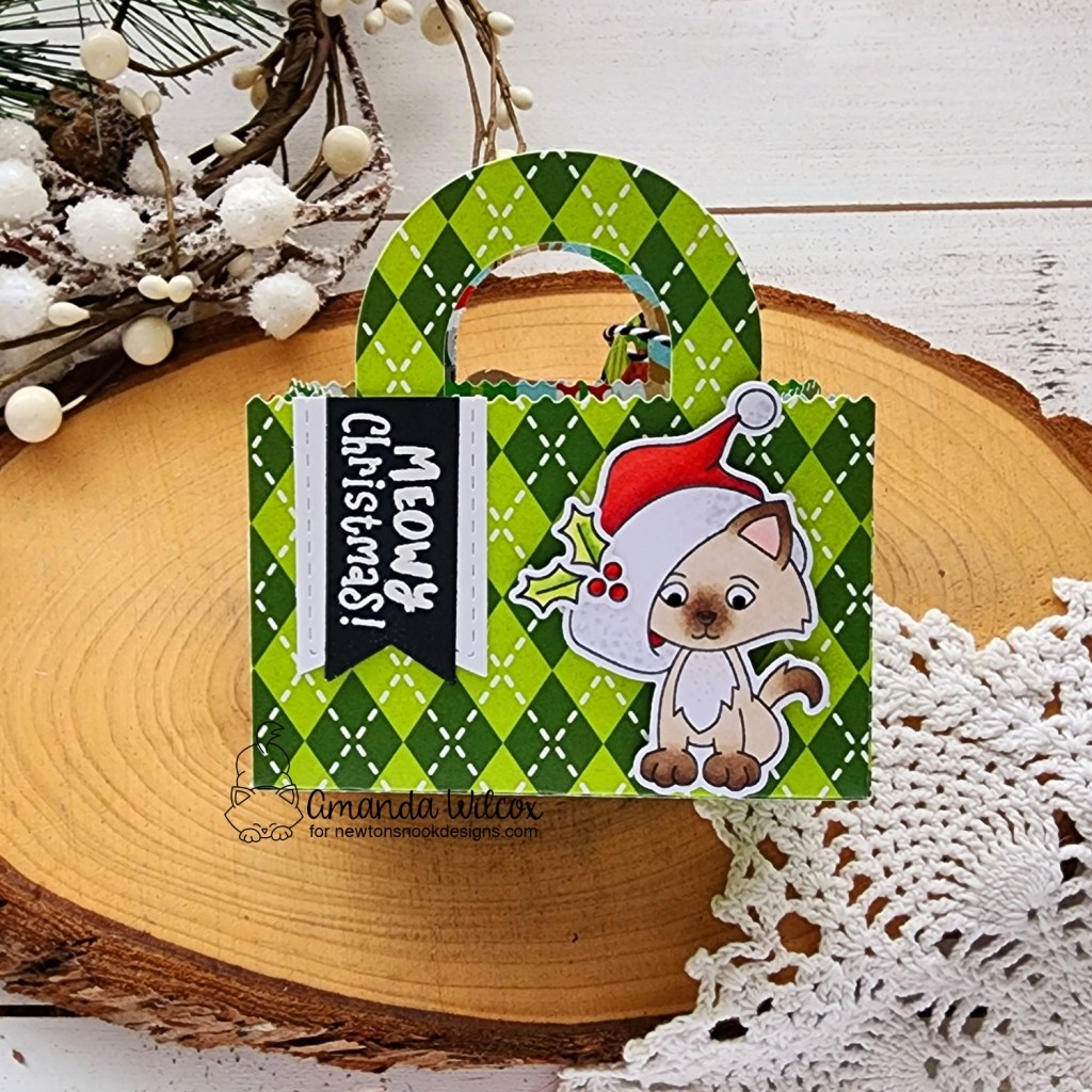 I started with the Newton’s Nook Canine Christmas paper pad so cut the bag and assembled it with EZ tear tape. Then, to decorate it I chose this sweet kitty from Newton’s Nook Christmas Kittens stamp set. I colored it with copic markers and used the coordinating dies to cut it out. I used a little liquid glue to add the holly to his hat and foam squares to attach him to the bag.