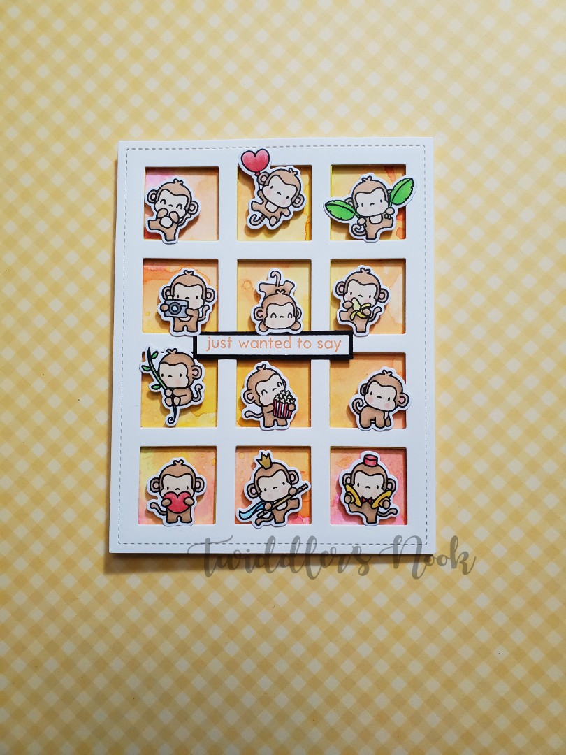 Then, I die cut the Mama Elephant Grid Window from white cardstock and also craft foam and layered them together. Then glued it to the card base and started laying out my monkeys. I attached the monkeys with foam squares for added dimension and then stamped a sentiment from the Avery Elle Peek-a-Boo Pals stamp set on white cardstock and layered it on a slightly bigger piece of black cardstock to help it pop.