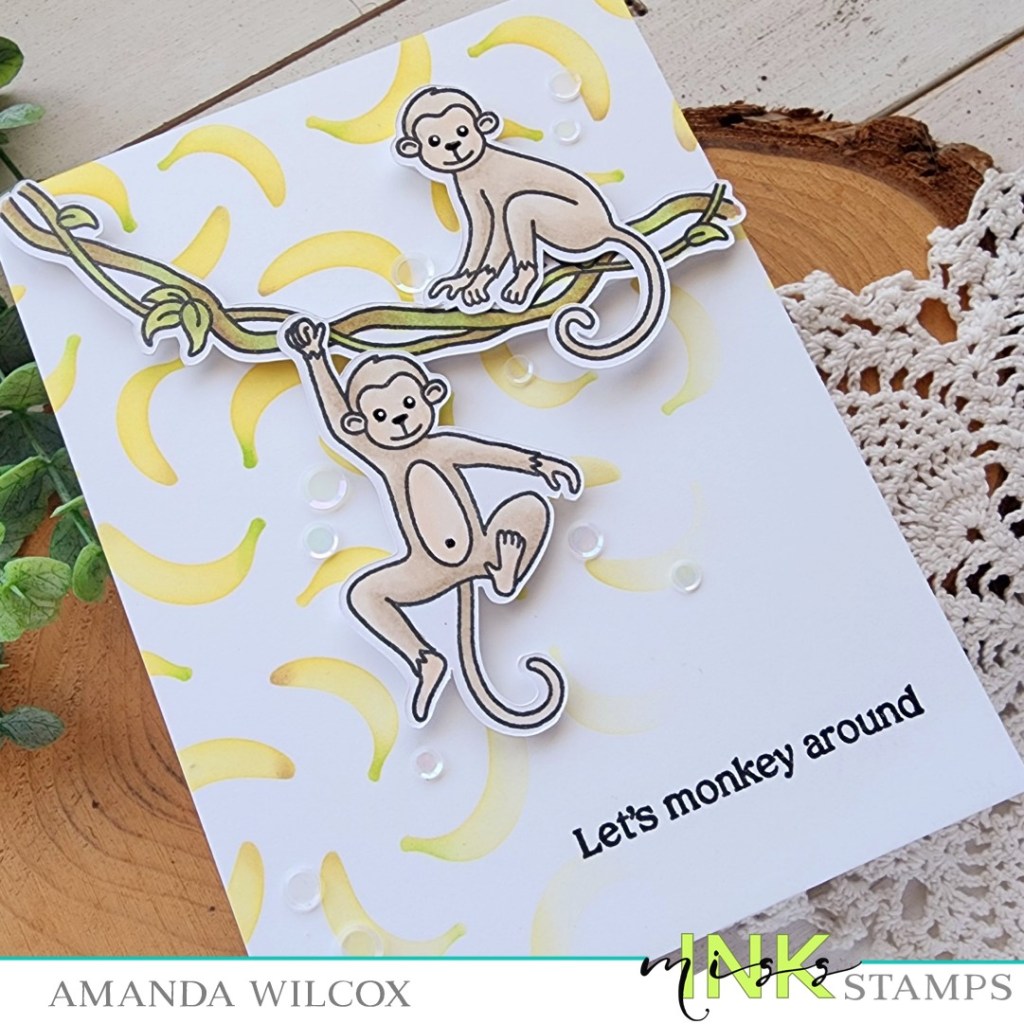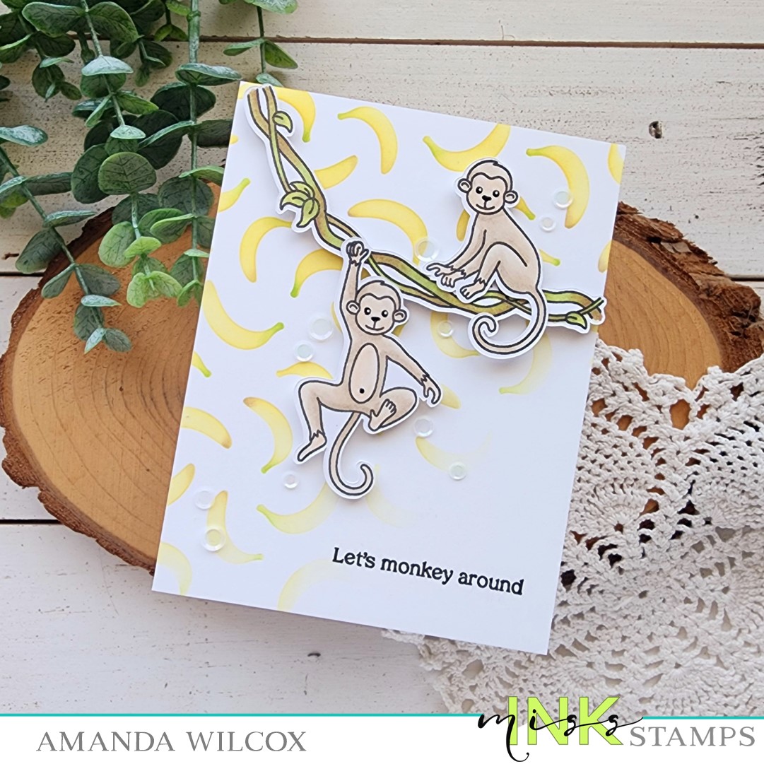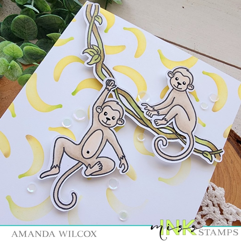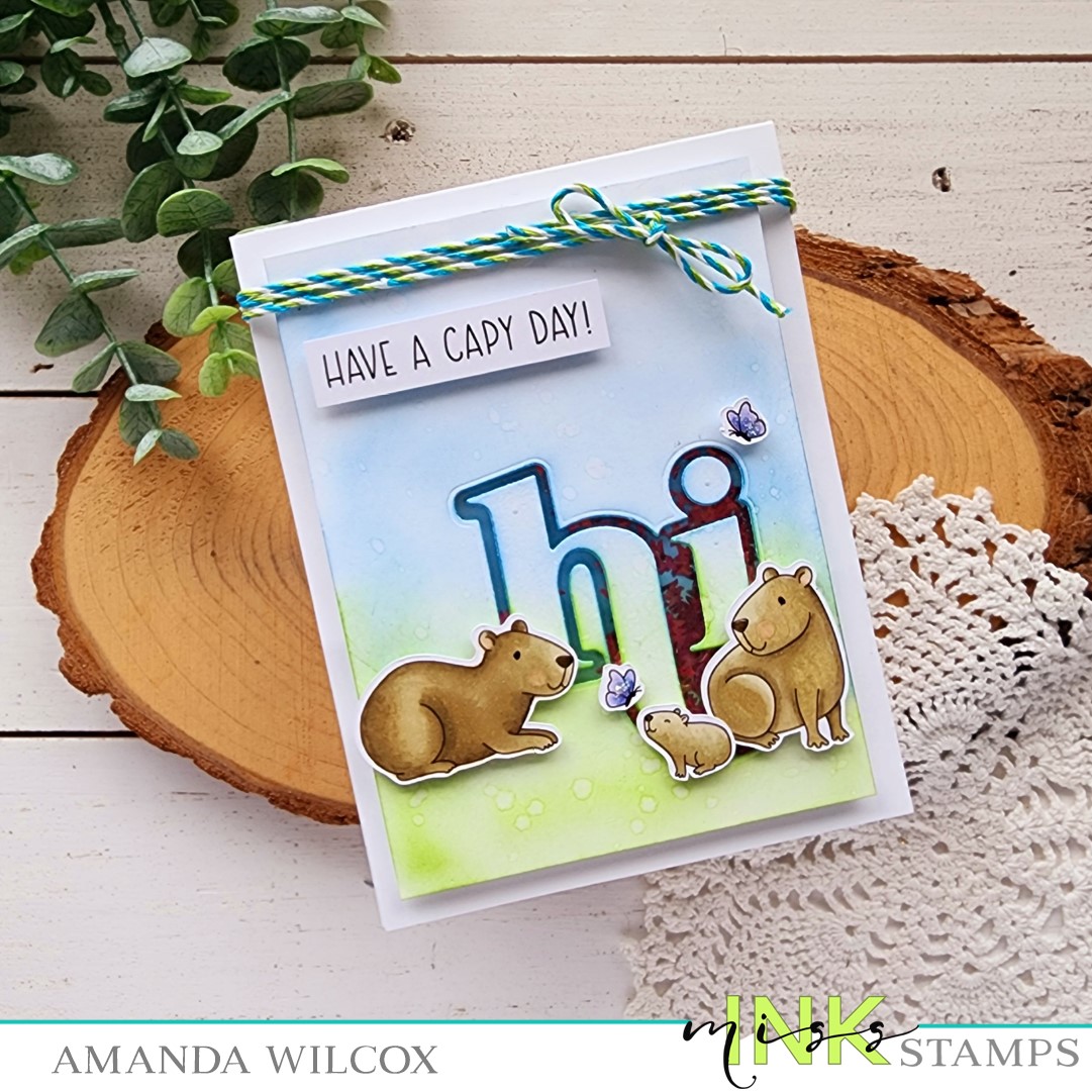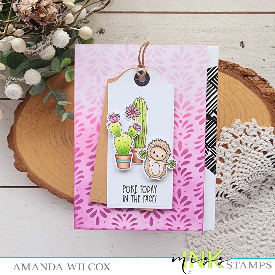 So I didn’t run the risk of smearing ink, I blended distress oxide ink from rustic wilderness to forest moss, into crackling campfire and topped it off with mustard seed. Then I used my keyhole panel as a guide and stamped images from Smokin’ Caterpillars and Wildflower. I lined the keyhole panel with foam tape and adhered it to the background panel.