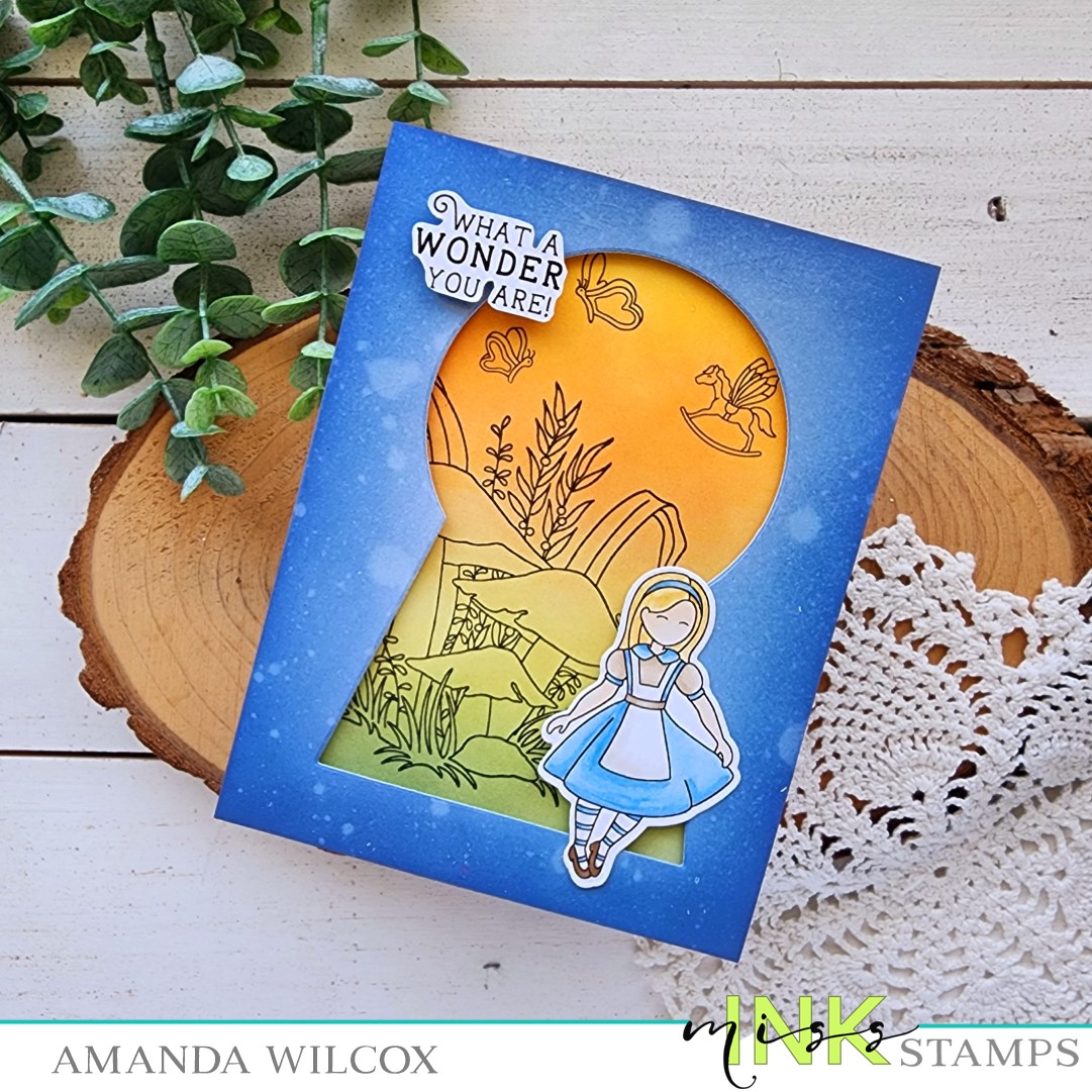 Hello everyone. I’m popping in with a bit of Alice inspiration from Miss Ink Stamps. I’m currently decorating my office at work and one corner is dedicated to Alice so I couldn’t help but pull this collection out and play a bit. It definitely made my heart happy.