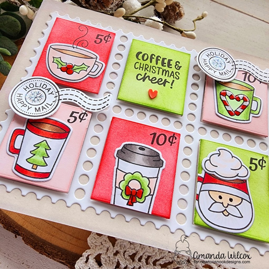 I loved that the new Christmas Coffees images were perfect to fit in the new Postage Stamp Layout die cut! So I grabbed a few images, stamped and started coloring. I didn’t have a plan per se but my brain sure had a color scheme in mind.