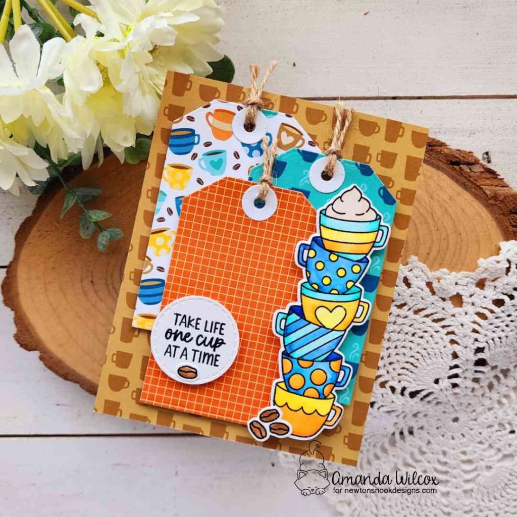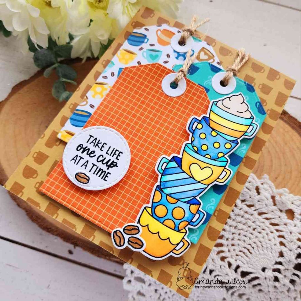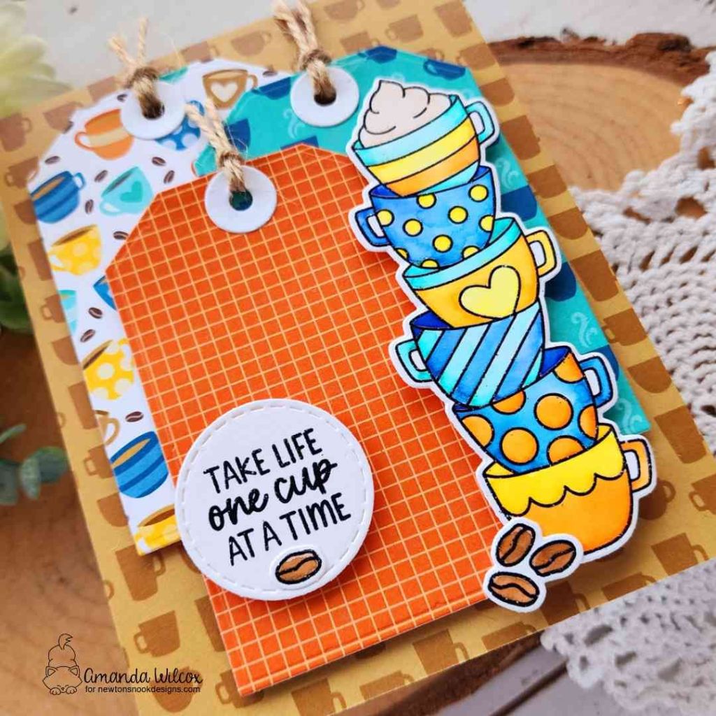 I glued the tags together with liquid glue and added foam tape to the back to them all plus my coffee cup stack. I adhered them to the patterned paper background and glued it all on a card base. Then I stamped and heat embossed my sentiment on a circle from the Circle Frames set and popped it up as well.
