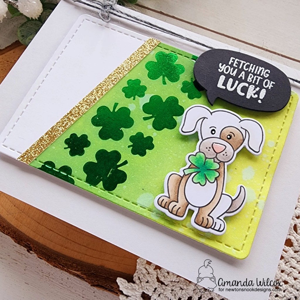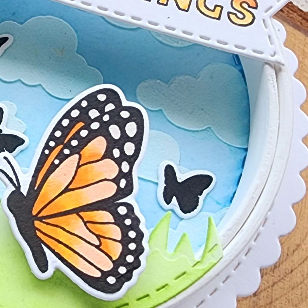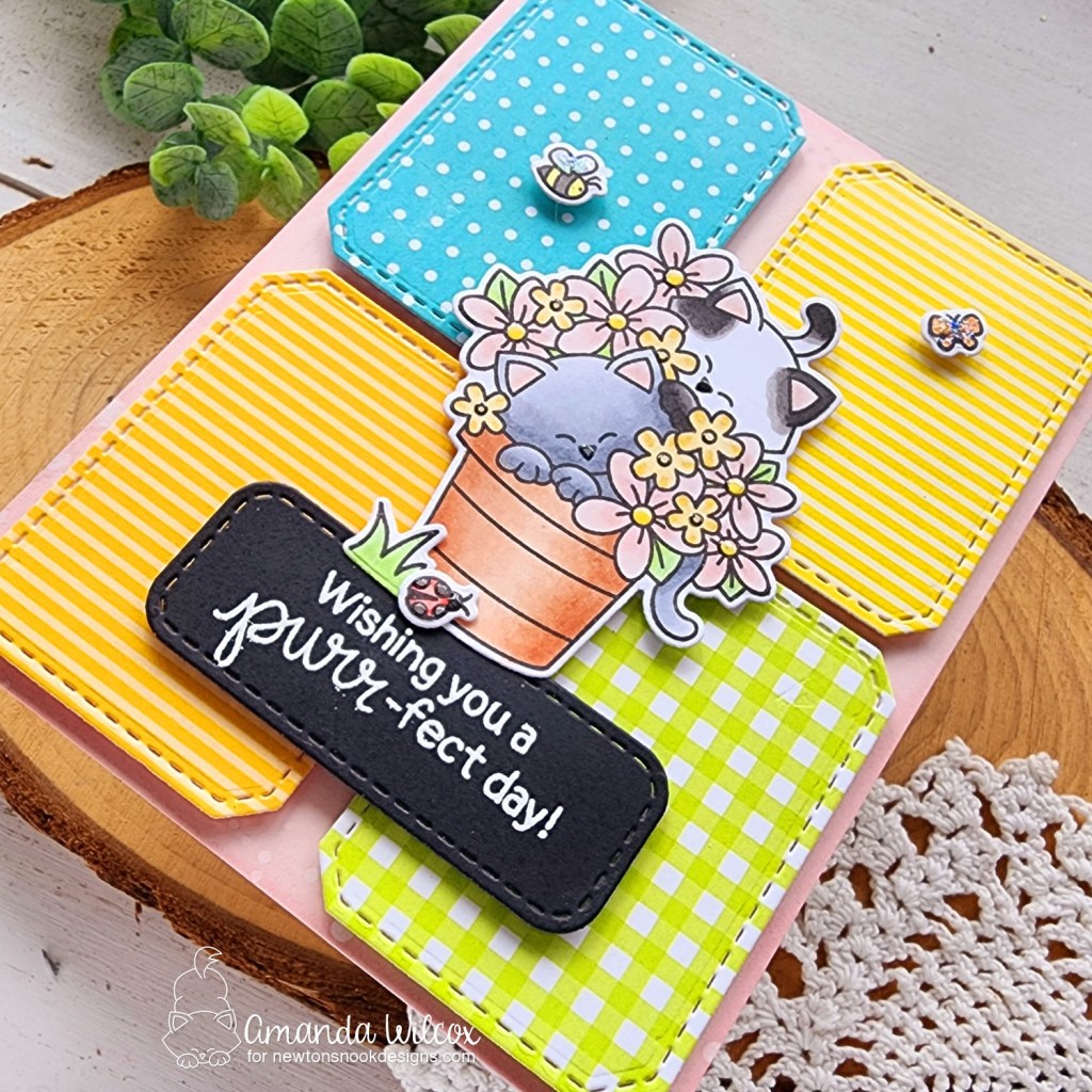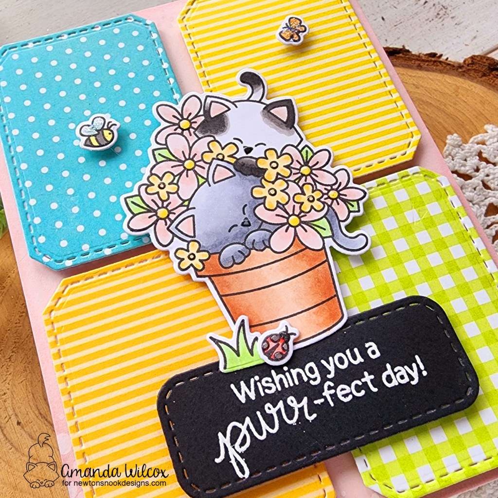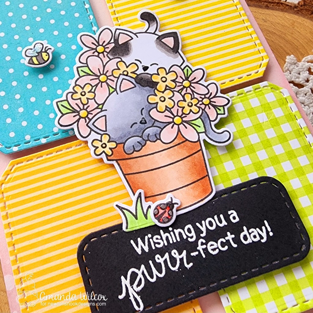 Next, I stamped images from Newton’s Blooms and colored them all with copic markers. I used the coordinating dies to cut it all out and then a little liquid glue to adhere the grass and ladybug to the pot. After arranging everything, I went digging for a shape to stamp my sentiment and ground the images. I found this rounded rectangle in the A7 Frames die set.