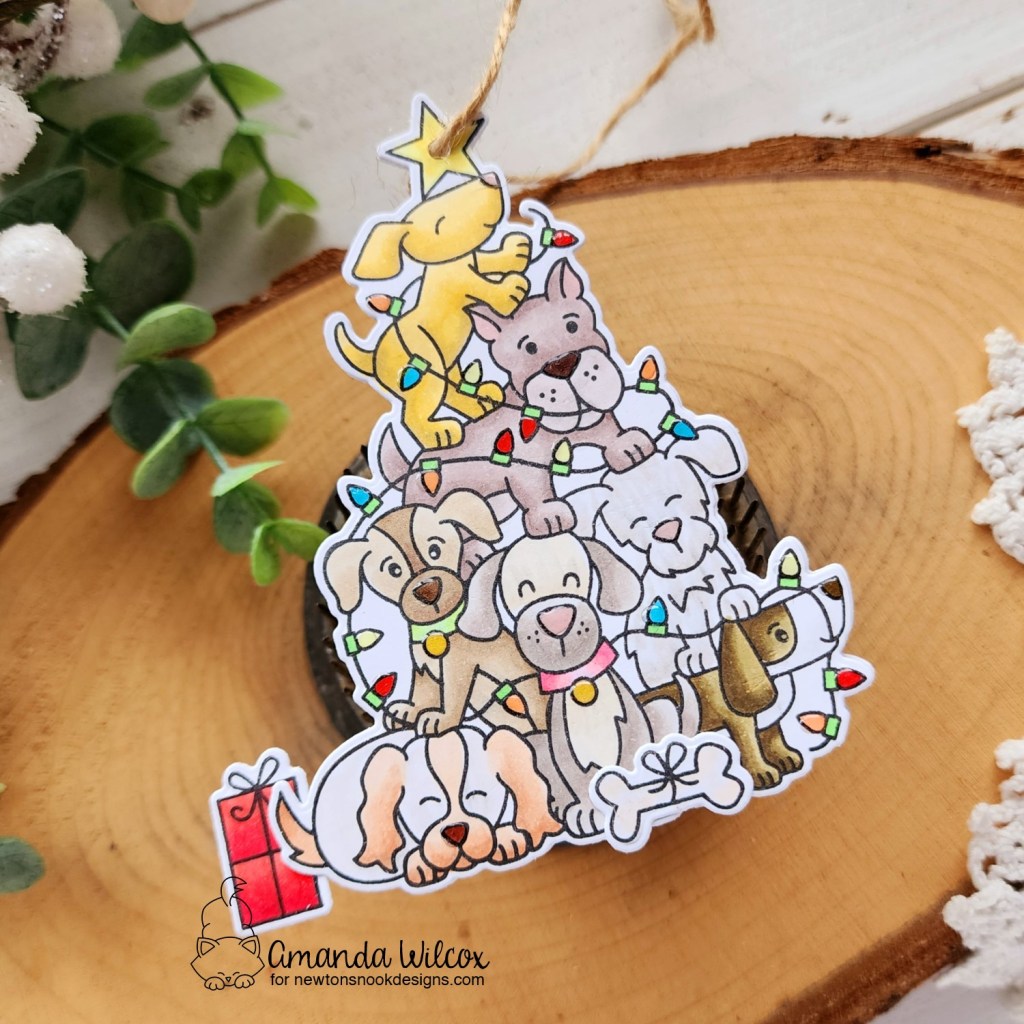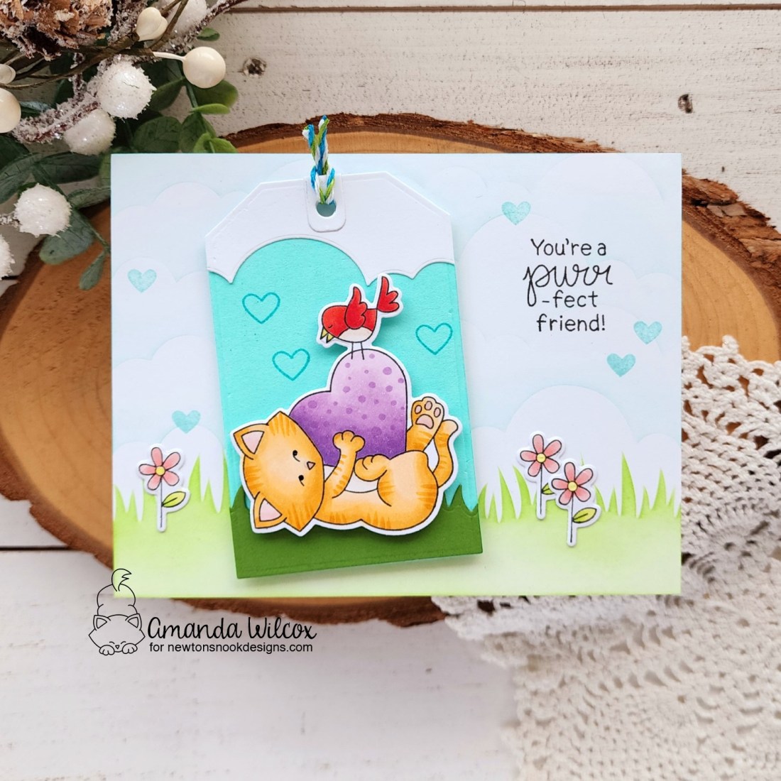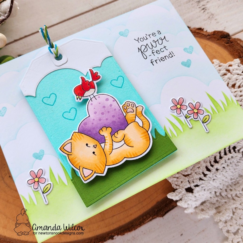 I stamped and colored the main image and some flowers from Newton’s Valentine and used the coordinating dies to cut them out. Then I used the Fancy Edges Tag, Land Borders and Sky Borders dies to create a mini scene tag to put it on.