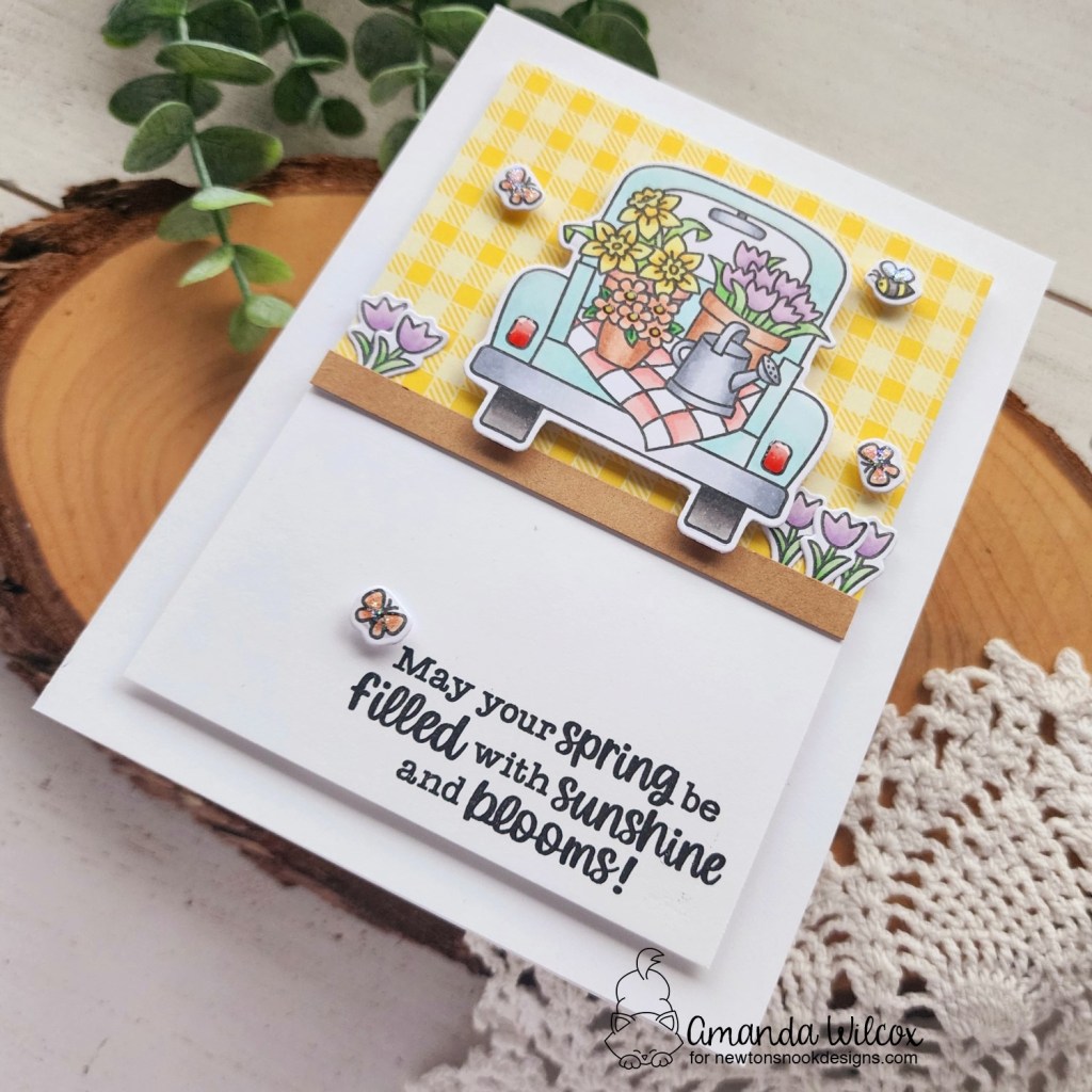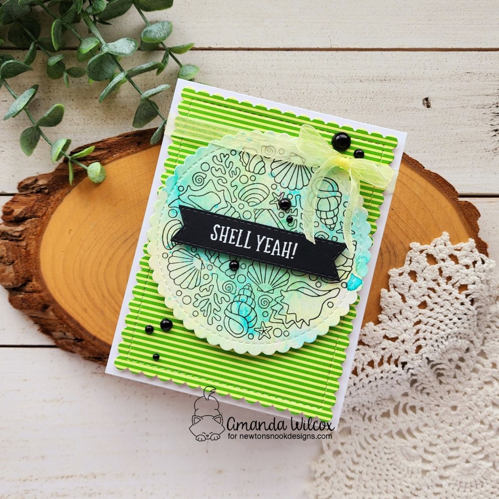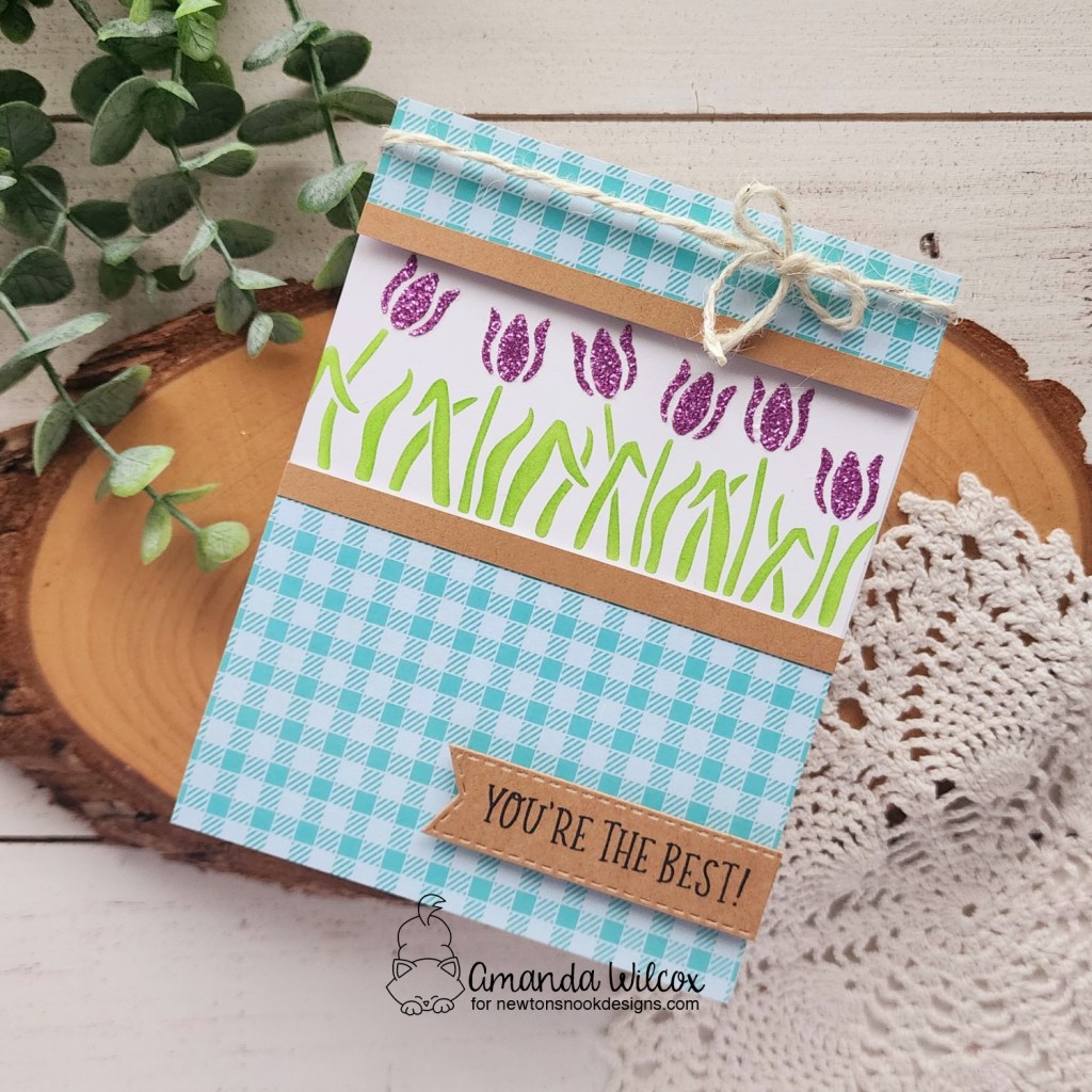 Another slimline for you but it was too perfect that this paper cut into strips and met up seamlessly! Then I added some plaid on the edges and popped it up on a slimline card base that I had inked with distress oxide squeezed lemonade. I also splattered it with green metallic watercolor for shimmer.