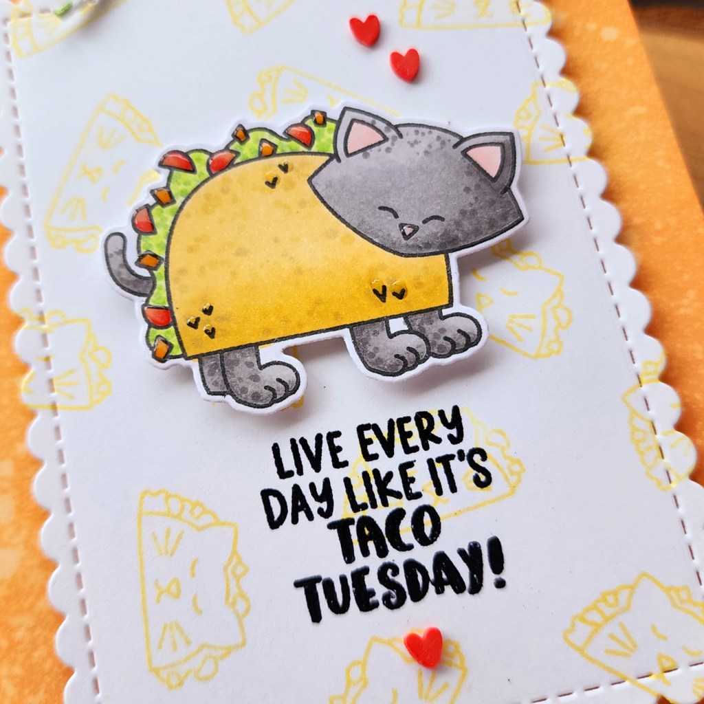 I was really feeling the warm tones so I kept with gray kitties to contract with my pink, orange and yellow ice cream! I used the coordinating die to cut them out and heat embossed my sentiment on a Speech Bubble die cut before popping everything up on the Bookmark die cut.