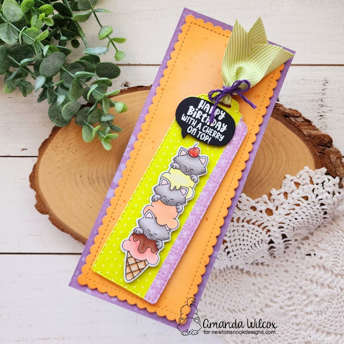 I have two cards to share with you today! First up, is Newton and his adorable stack of ice cream cones. Perfect for the Bookmark dies and a slimline card! I just had to do it.