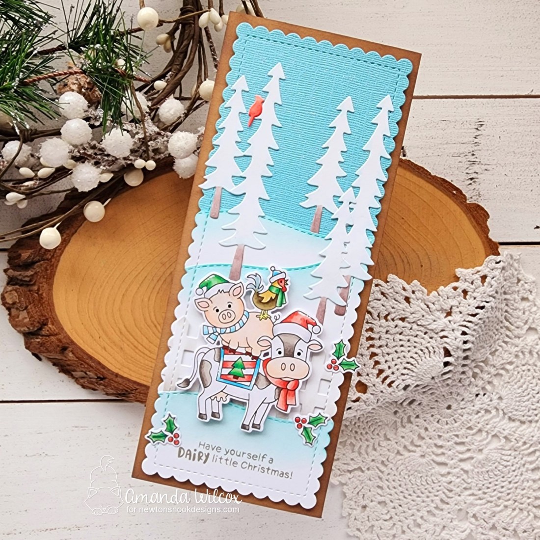 For my card, I started by stamping and coloring the adorable Dairy Christmas images, plus a couple of extra holly bits. I used the coordinating dies to cut them out and set them aside to start cutting all the layers to my slimline scene.