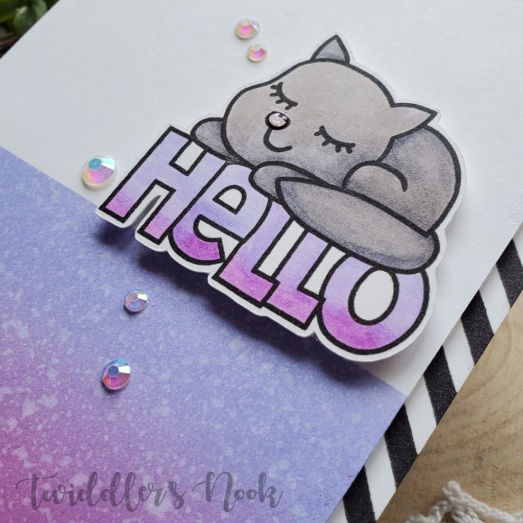 I adhered the images together with tape runner and them attached them to the card front with foam squares. You know me, I had to add some finishing touches so I grabbed the white gel pen and added highlights, then glossy accents to the kitty’s eyes. Finally I pulled out Nuvo Crystal Drops in simply white and party pink and scattered them about.