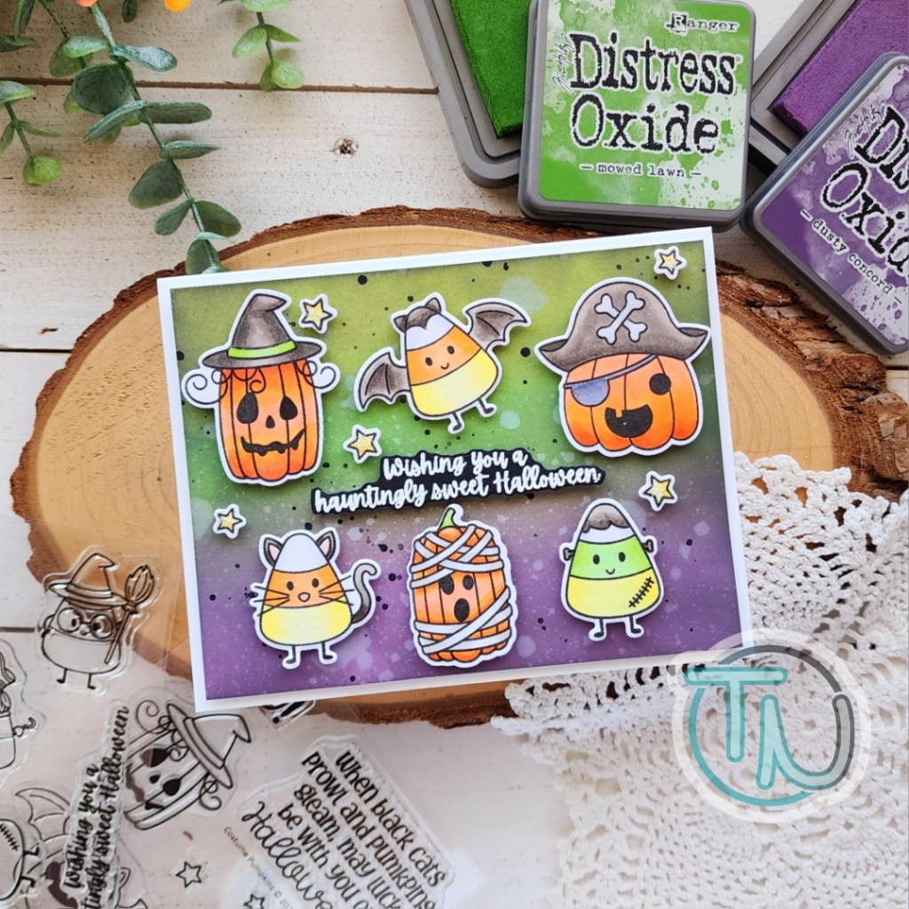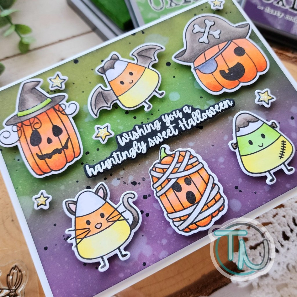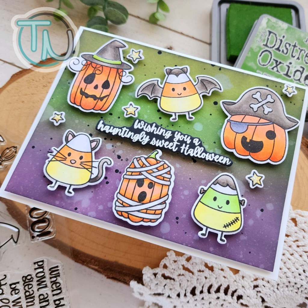 My card today combines a new set and a set released last year combined together. Aren’t these images so spooky fun!?! I love them! The pumpkins are new from Costume Pumpkins and the candy corn cuties are from last year called Hauntingly Sweet.