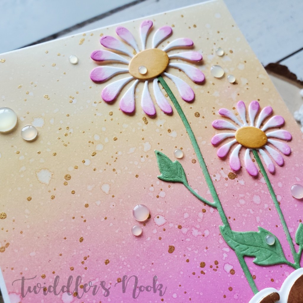 For today’s card, I started by die cutting my flowers from heavy weight cardstock and colored them with copic markers. Playing off the colors I chose for the flowers, I inked up a panel with distress oxide inks using picked raspberry and scattered straw. I spritzed the panel with water and then flicked gold watercolor on it. Once it was dry, I trimmed it down to 4 1/8 x 5 3/8 so there is just a teeny white border showing from the cardbase. The flowers are glued directly to the inked panel and that is popped up on the card base with foam tape.