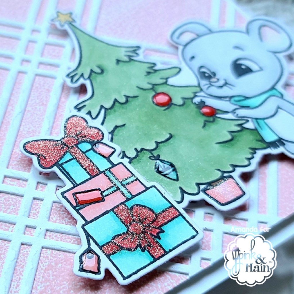 I love adding finishing touches to my projects! …almost as much as I love creating the projects themselves. I feel like they aren’t complete until I add some little details. For this card, I added glossy accents to the christmas ornaments, package tags and the mouse’s nose. Then I went back with a Wink of Stella glitter brush pen and glittered up the package ribbons, star and tree base.