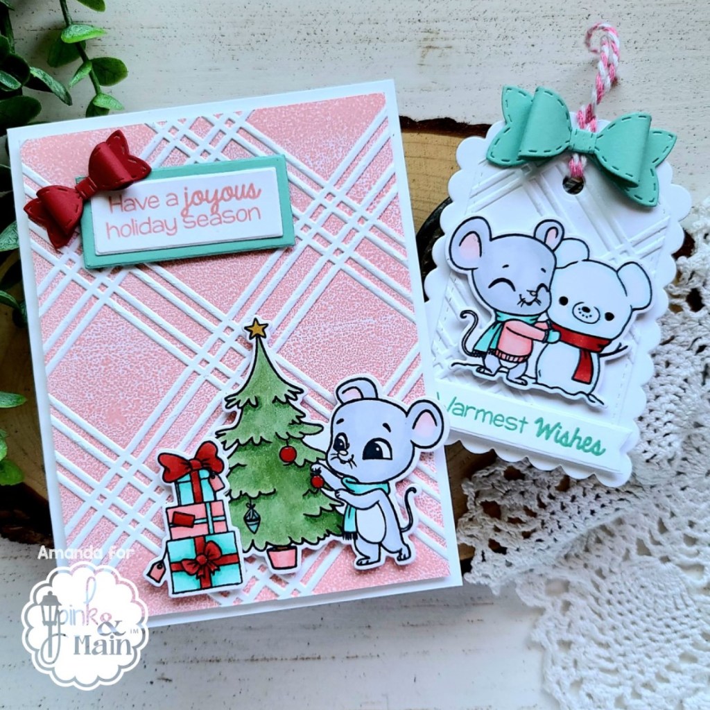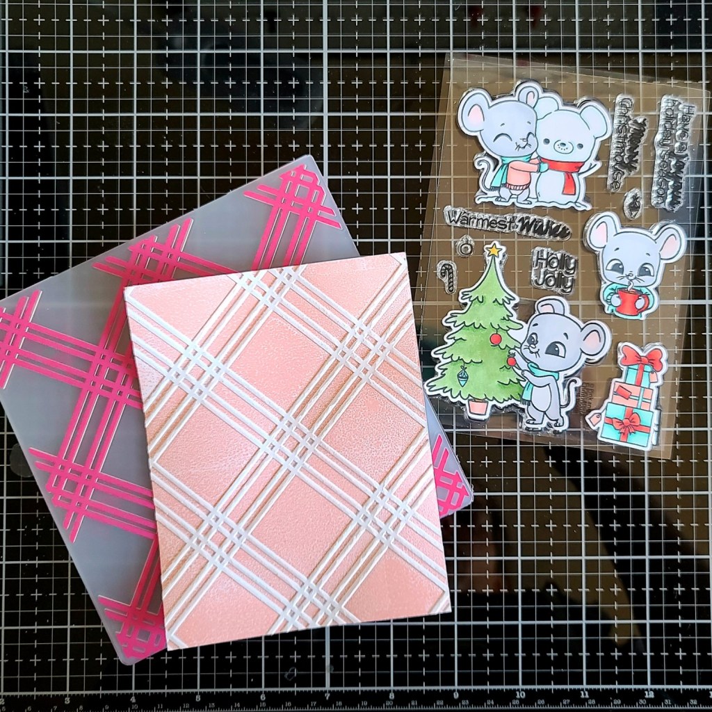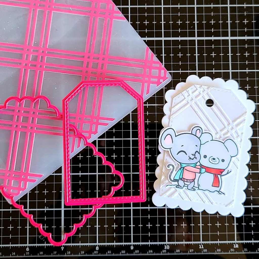 I had colored all the images at the beginning, unsure of my final design and while I was working on the card I thought it would be so cute to make a coordinating tag to go with it. So I die cut the Fancy Tags pieces from white and then ran the stitched panel through my die cut machine with the plaid embossing folder, without inking it this time. I glued those layers together and popped up my mouse image with foam squares. I stamped another sentiment from Christmouse, in mint this time, and cut it out with the banner die in the Fancy Tags Die Set. It’s also popped up with foam squares.