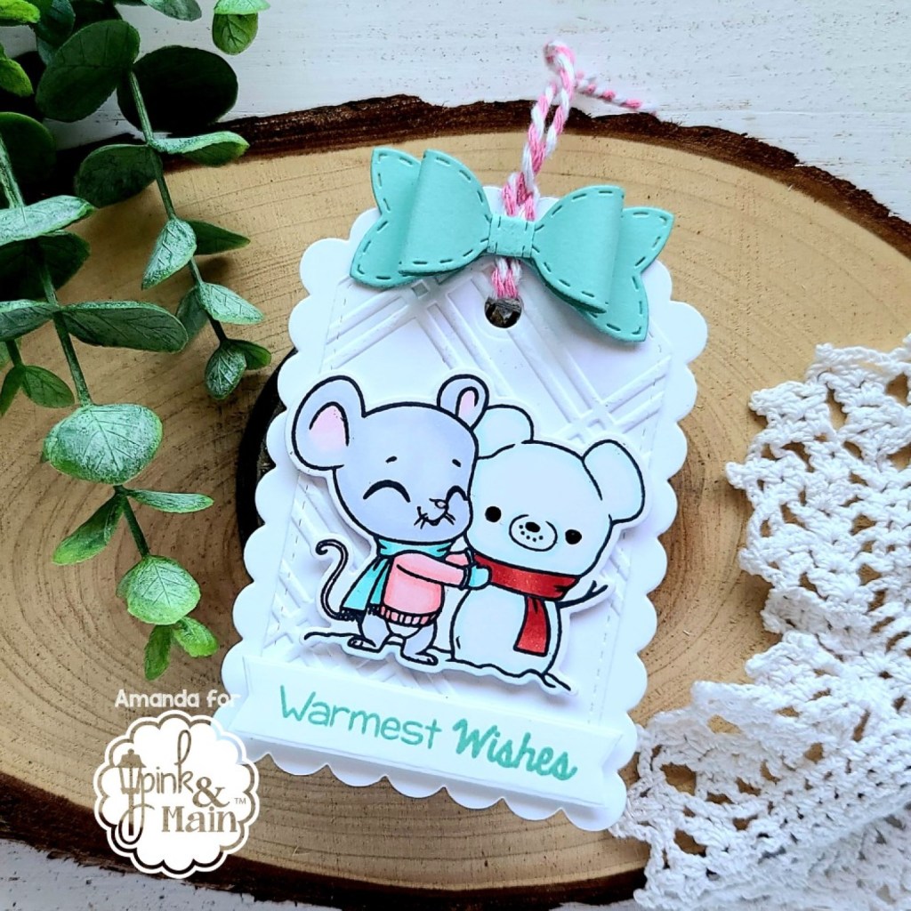 I strung some pink and white baker’s twine through the hole, created a medium stitched bow in mint and glued it in place. For finishing details on this little tag, I added glossy accents to the mouse’s nose and black glaze pen to the snowmouse’s eyes and nose.