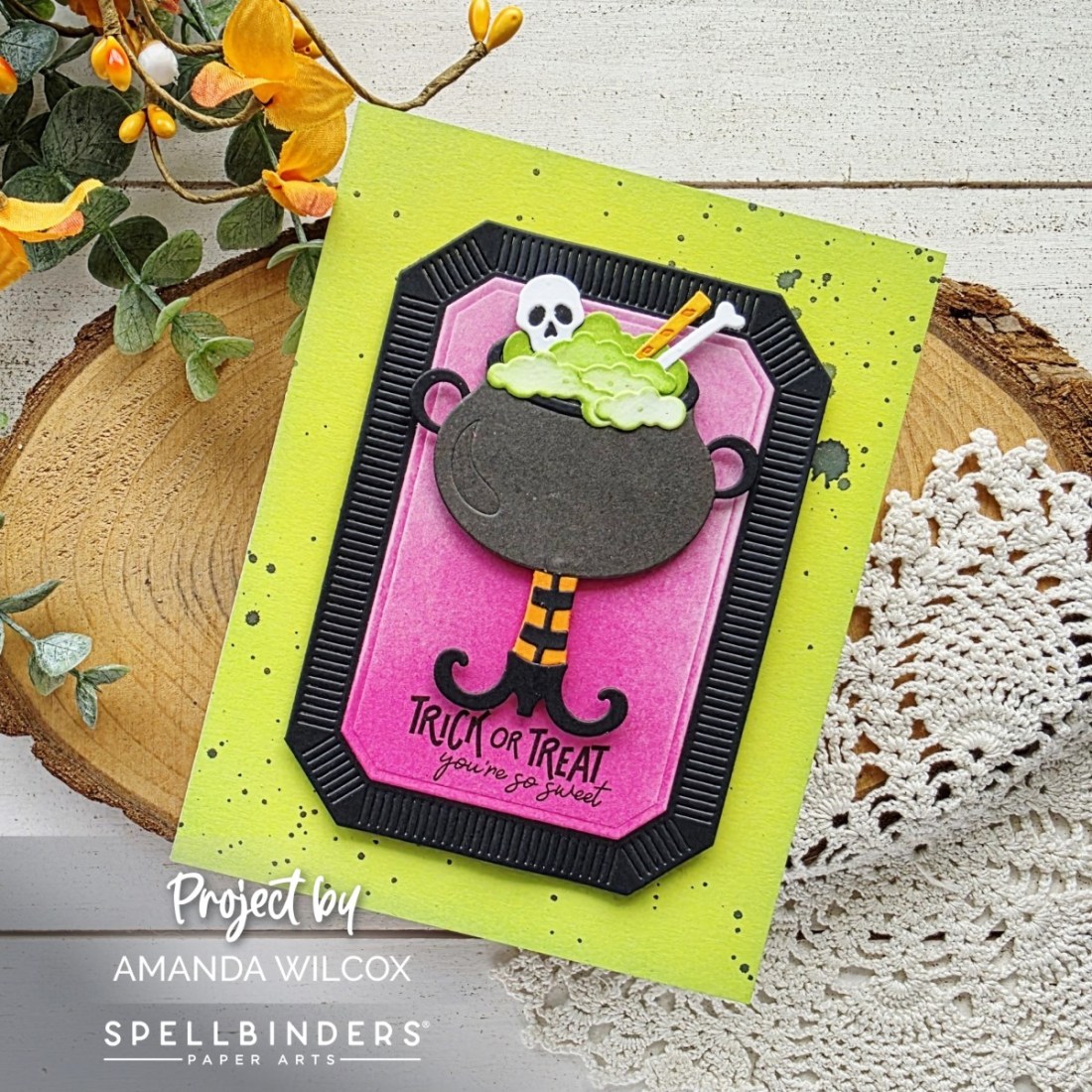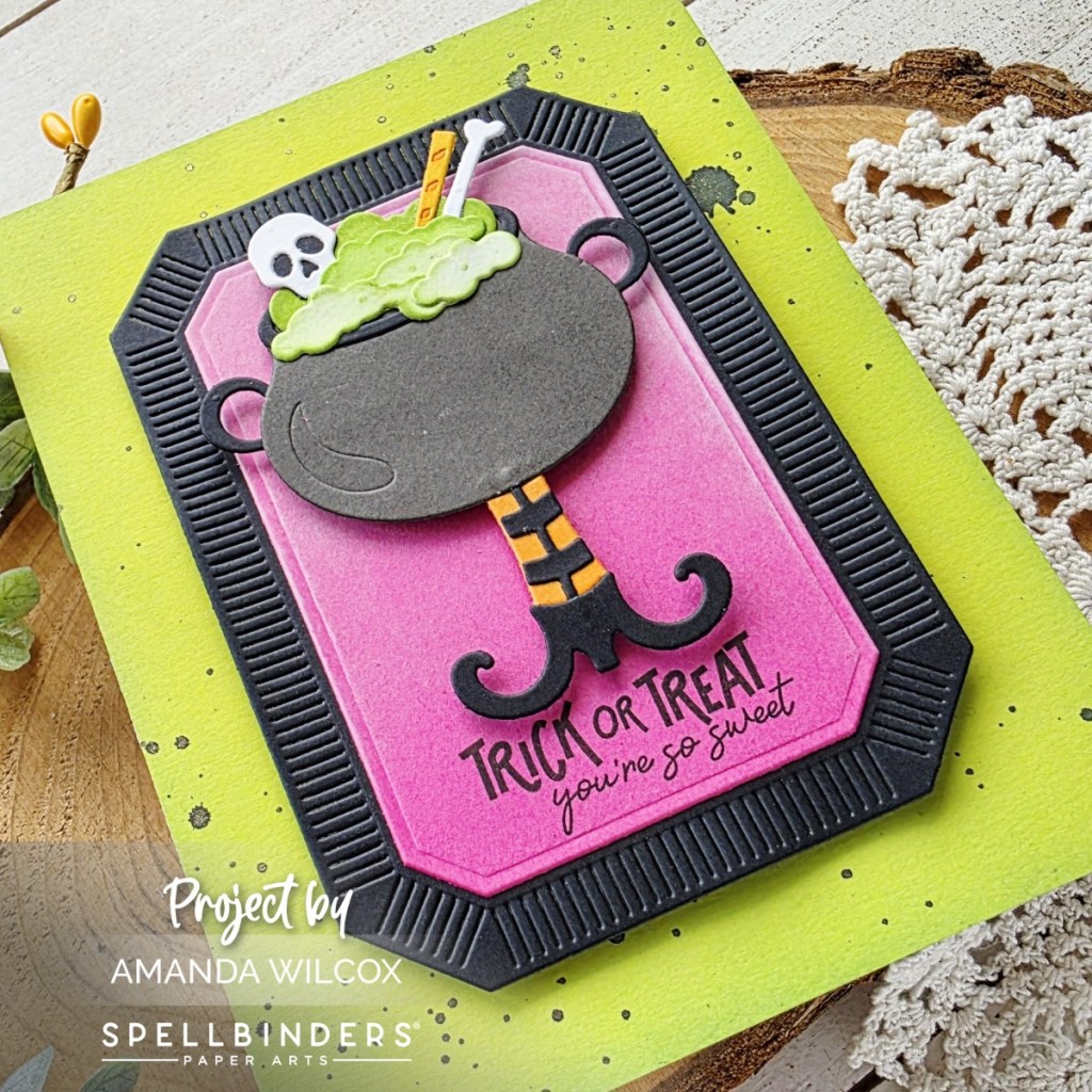 After building my awesome cauldron with legs, I pulled out the Notched Rectangles again to bring that focal point together. I cut the inside layer from dark pink cardstock and inked the top with white pigment ink to soften it, then stamped my sentiment on the bottom.