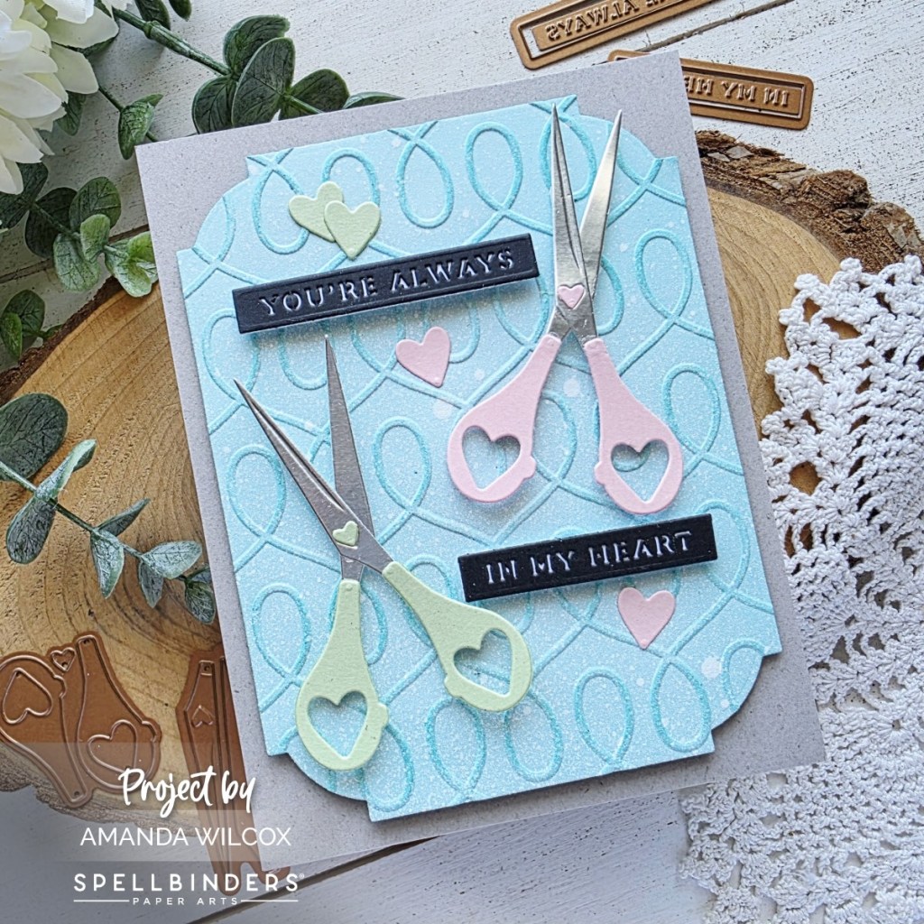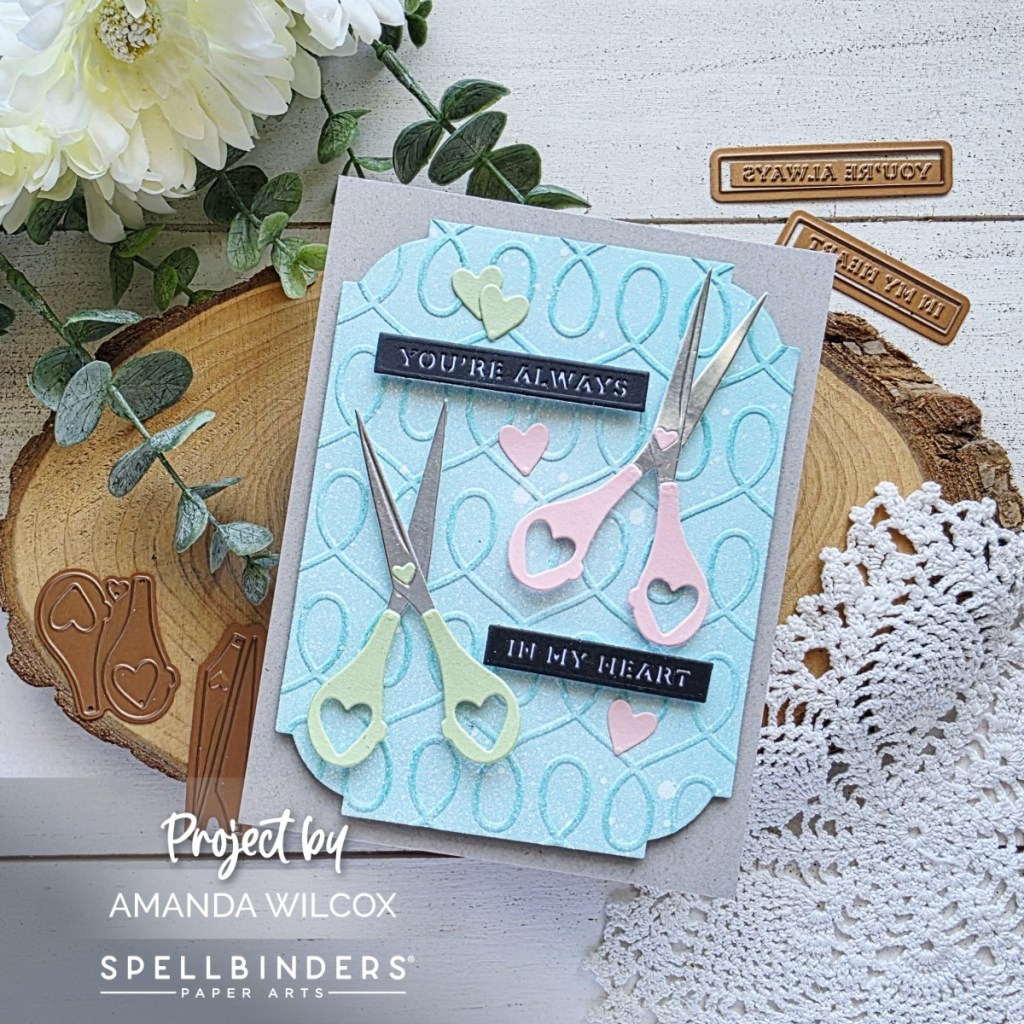 Hi friends. I’m honored to be sharing my card with you today. Spellbinders released this sweet die set called Sharon’s Scissors in honor of Sharon Kilma, a longtime craft shop owner who suddenly passed from heart disease earlier this year. A portion of the proceeds for this die set are being donated to the American Heart Association.