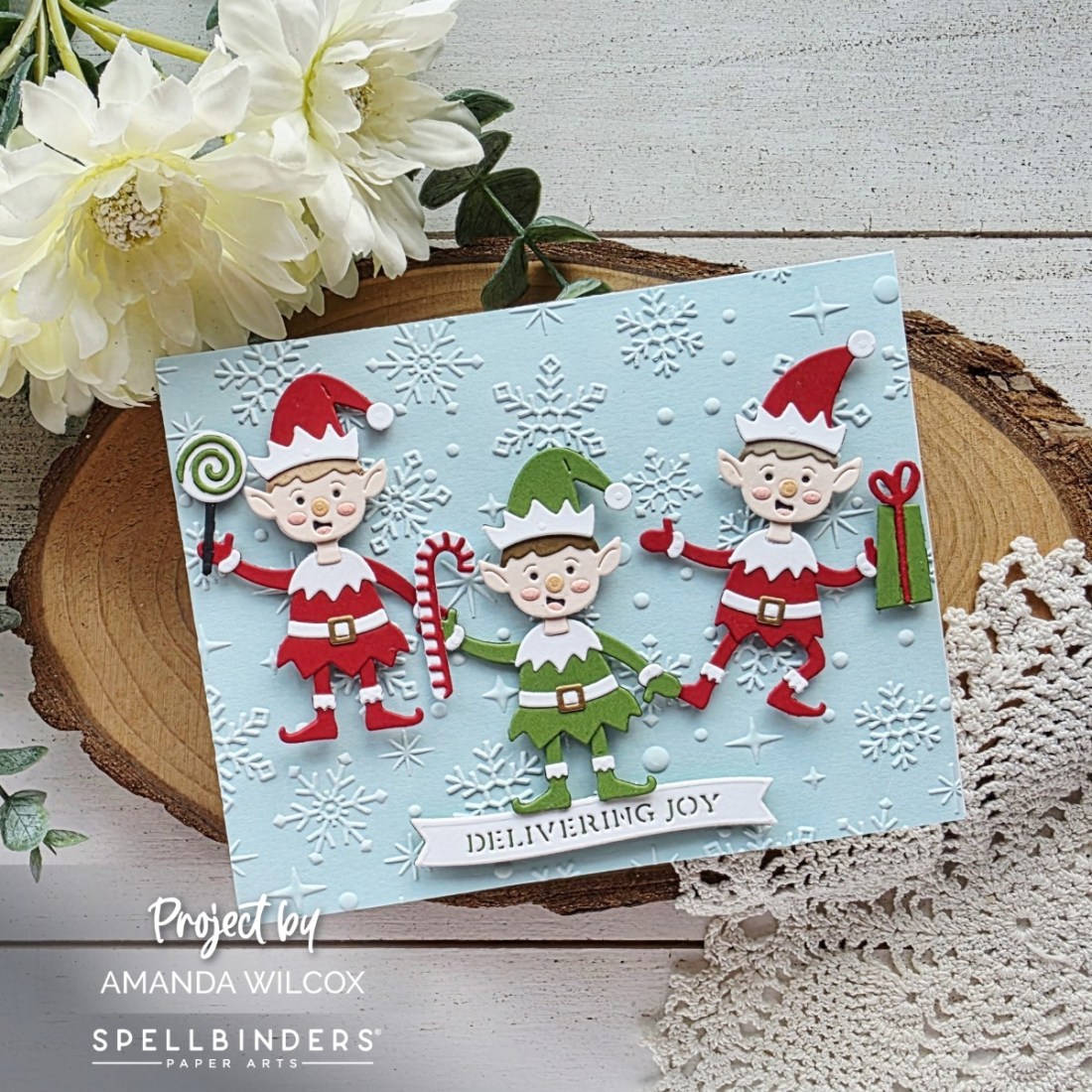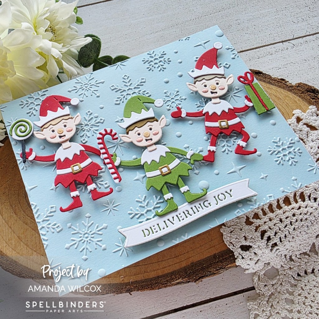 Hi everyone! I’m back today with some more Christmas in July from Spellbinders. This card features one of the adorable die sets from the Simon Hurley North Pole Friends collection that came out this month. These elves are adorable and so fun to build!