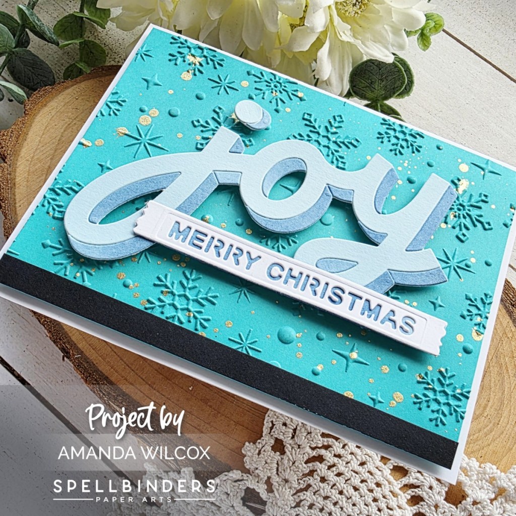 First up I have a very wintery feeling card featuring that bold Joy shadow sentiment, paired with a banner from last month’s North Pole Sentiments set and the Sparkling Snow 3D embossing folder from the year before.