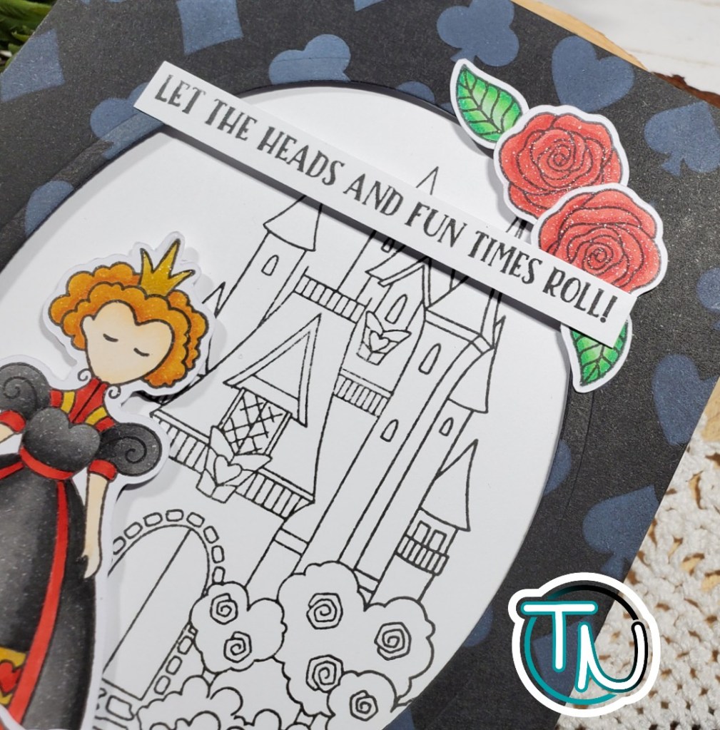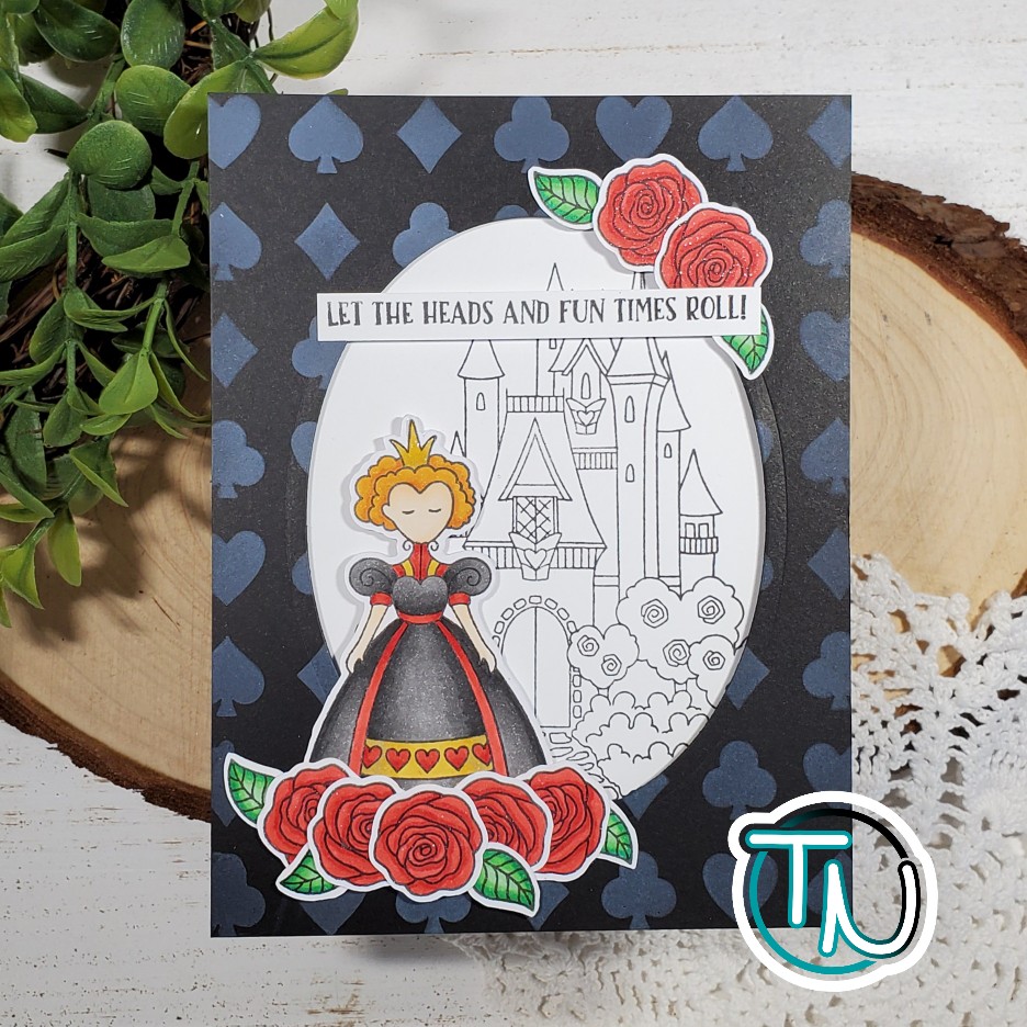 I started this card by stamping my images from Queen of Hearts and colored them with my copics. Then I used my scan-n-cut to cut them out and set them aside to work on my background. I took a 4.25×5.5 black cardstock panel and used white pigment ink with the Pick a Card stencil. Then I die cut an oval from the center. Using this panel and a white card base, I decided on the placement of the Queen’s Castle image and used my MISTI to stamp it.