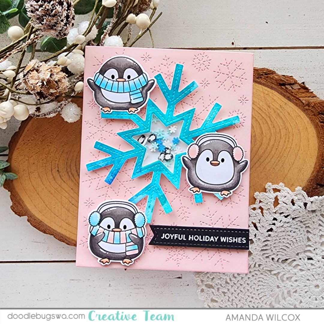 Next, I stamped and colored some sweet penguins from the Sunny Studios Roly Poly Penguins stamp set. I used the coordinating dies to cut them out and set it all aside. I couldn’t decide how I wanted my background – ink blended or solid and then I came across the Lawn Fawn Stitched Snowflake cover die and all my questions were answered. It’s the perfect backdrop!