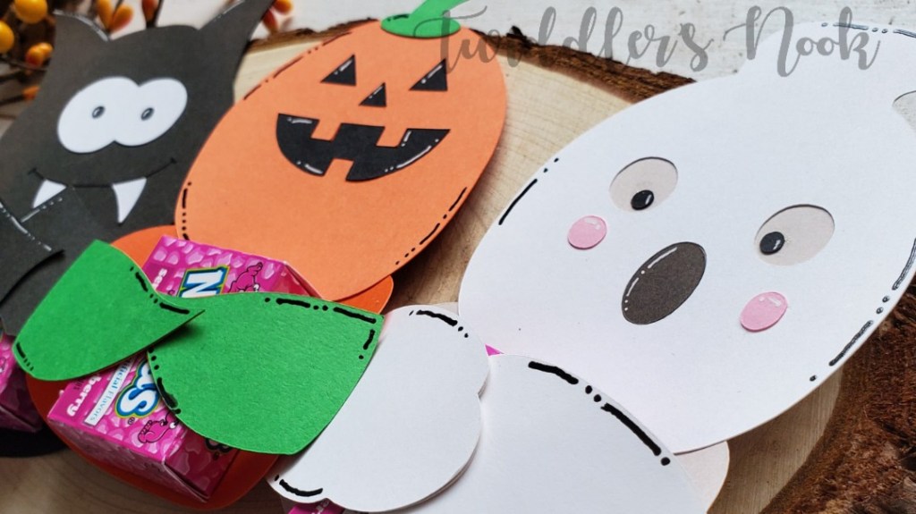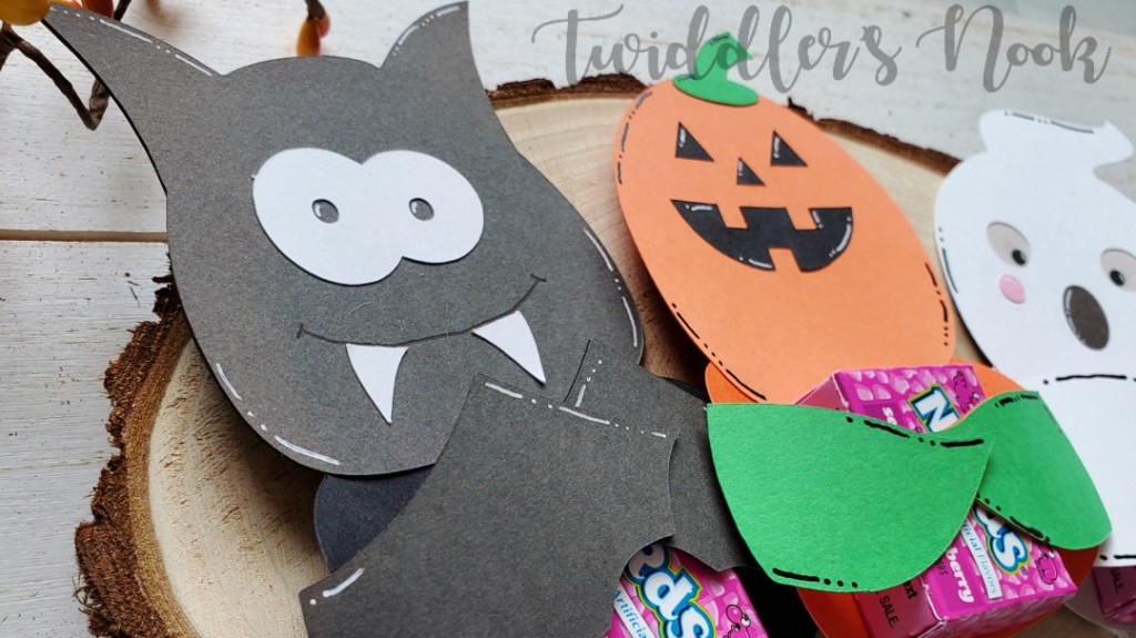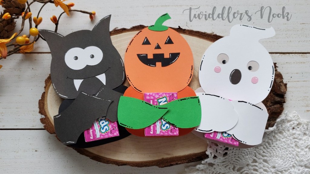 The file you purchase comes with all three of these Halloween cuties! They are designed to hold Hershey’s Nuggets but I decided to change it up a bit and put mini Nerds boxes instead.