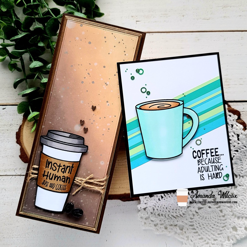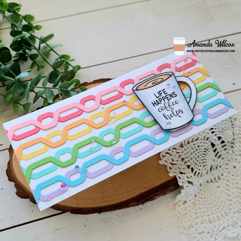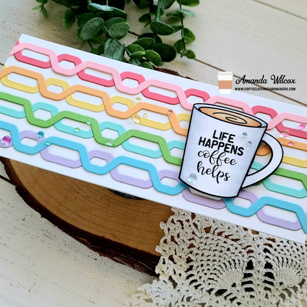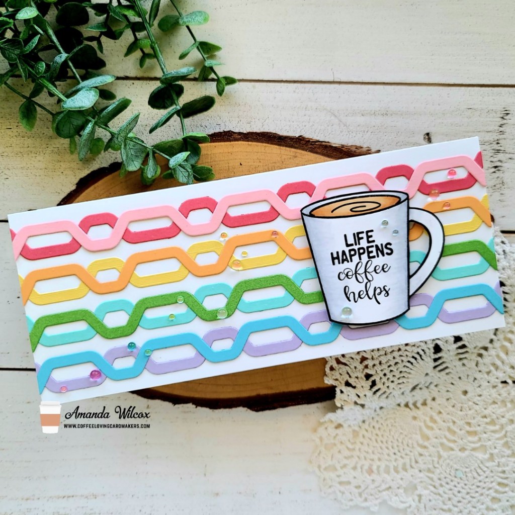 Hello there! It’s time for Tuesday Tea over on the Coffee Loving Cardmakers today. I recently indulged in the overstock sale at Scrapbookpal.com and snagged a few things I had been resisting prior to now. When my order came in I just had to cut this cool MFT Stamps Color Block die immediately and play with it. It’s super fun to intertwine together, stack and layer.