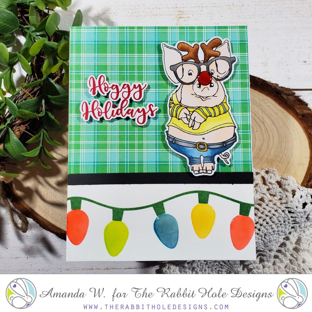 Okay, I couldn’t get enough of this pig with the glasses on so I reached for him a second time and decided to showcase him on his own. I inked the new Light Me Up stencil across the bottom of my card front and the added patterned paper and a black strip to break up the two and give my pig a floor to stand on. I stamped, colored, cut out my pig and them popped him up with foam squares. I also stamped and cut out my sentiment and popped it up too. For finishing touches I added glossy accents to the piggy nose and Christmas lights.
