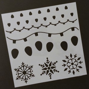 For this fun card I used the smaller lights from the Light Me Up stencil across the whole background. Then ink blended distress inks and spritzed it with water for a distressed look. I die cut a circle from both green cardstock and vellum and glued them together, then popped them up on the background with foam squares. I also popped up my mouse and heat embossed sentiment. For finishing touches I added Wink of Stella to the hat, glossy accents to the nose and ornament and scattered some opalescent gems across the card.