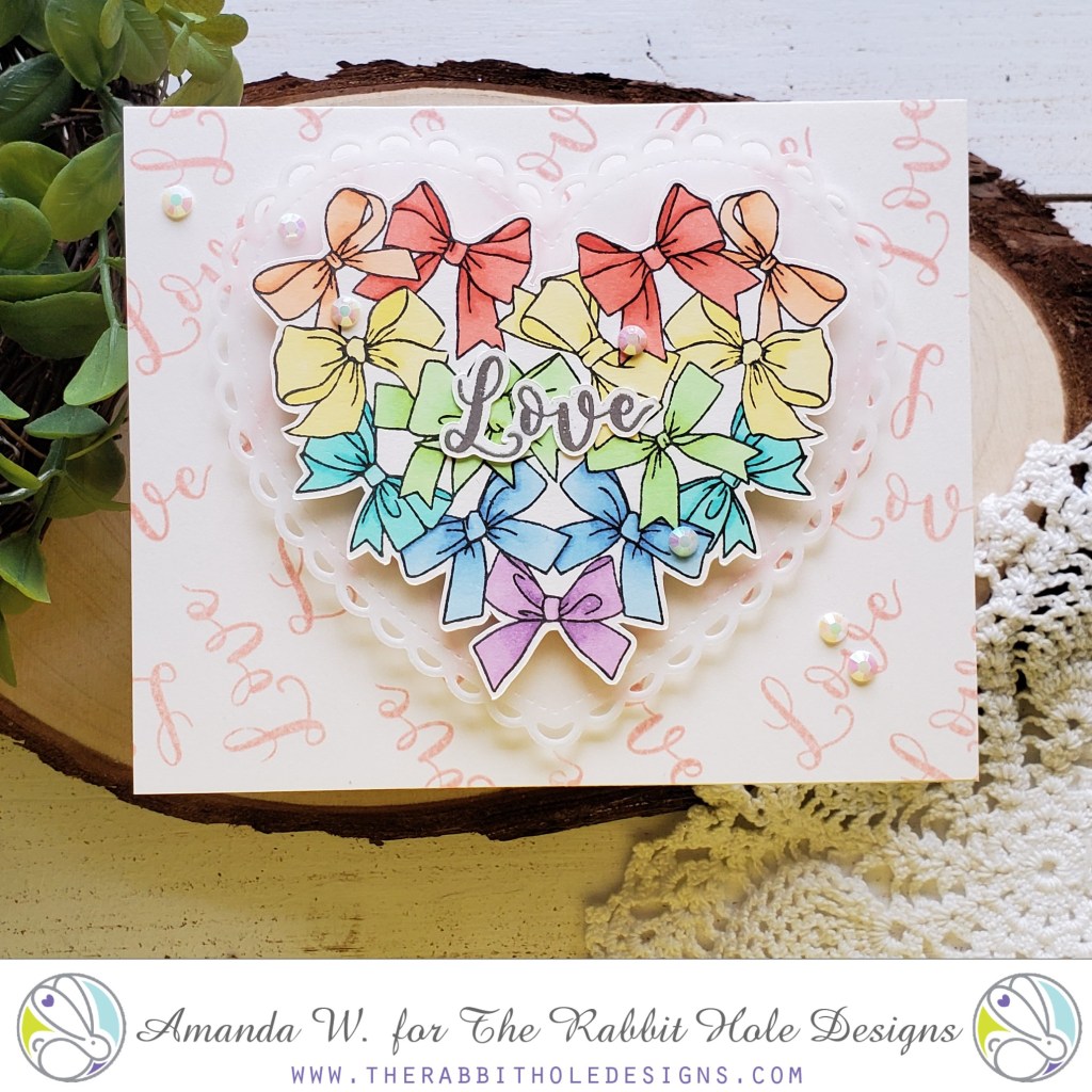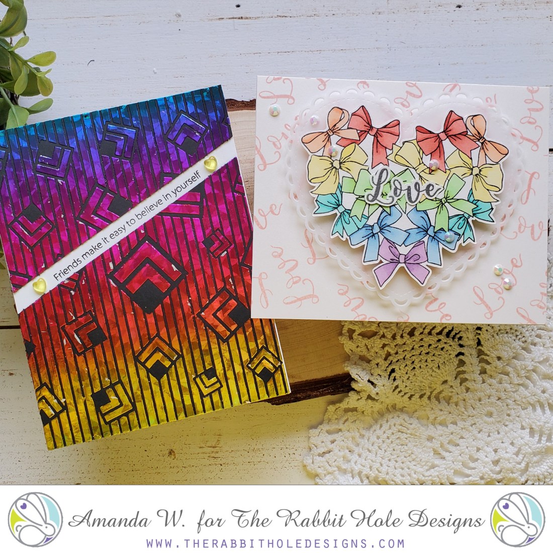 Thank you so much for stopping by to celebrate day 3 of The Rabbit Hole Designs new release blog hop! It’s been so much fun so far and today we’ve got even more to share. The stamp set for today is called Put a Bow On It and it’s adorable! There’s also another stencil that is mind blowing – Square Illusion. These are versatile and so fun to play with.