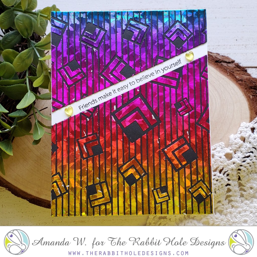 Using the Square Illusion stencil I added transfer gel to a black panel and set it aside to dry. Then I sent it through my laminator with some fractured rainbow deco foil for a bold background. Not wanting to take away from that, I decided to slice the panel at an angle and cut off about a quarter inch from each side. It gave me a perfect gap to add a simple sentiment from Sassy Sentiments and some heart embellishments.