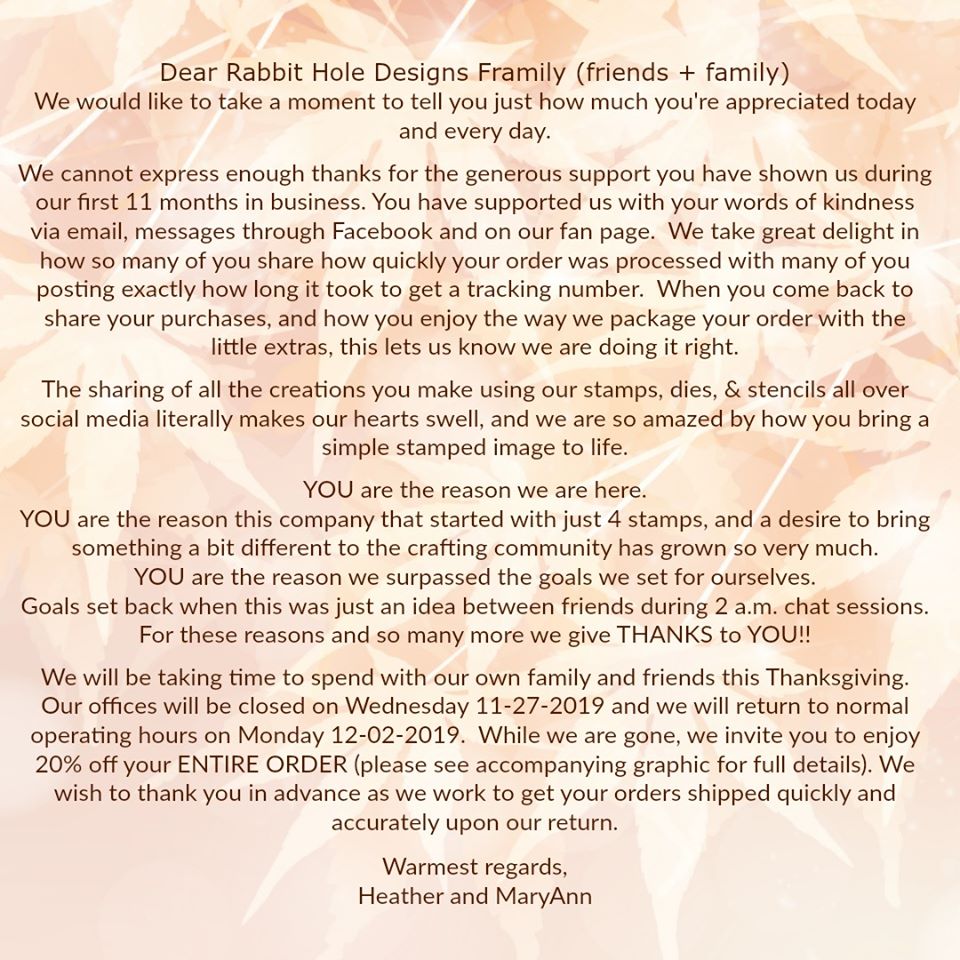 To celebrate day 2 of inspiration The Rabbit Hole Designs is giving away the 2 stamp sets promoted on 10-29-19, to one lucky winner. Winner will be chosen at random from the comments left on participating blogs, so make sure to visit each stop and leave a comment. Leave comments by 11:59 pm PST 10-31-19-19 on all participating blogs. Winner will be announced on The Rabbit Hole Designs blog 11-01-2019