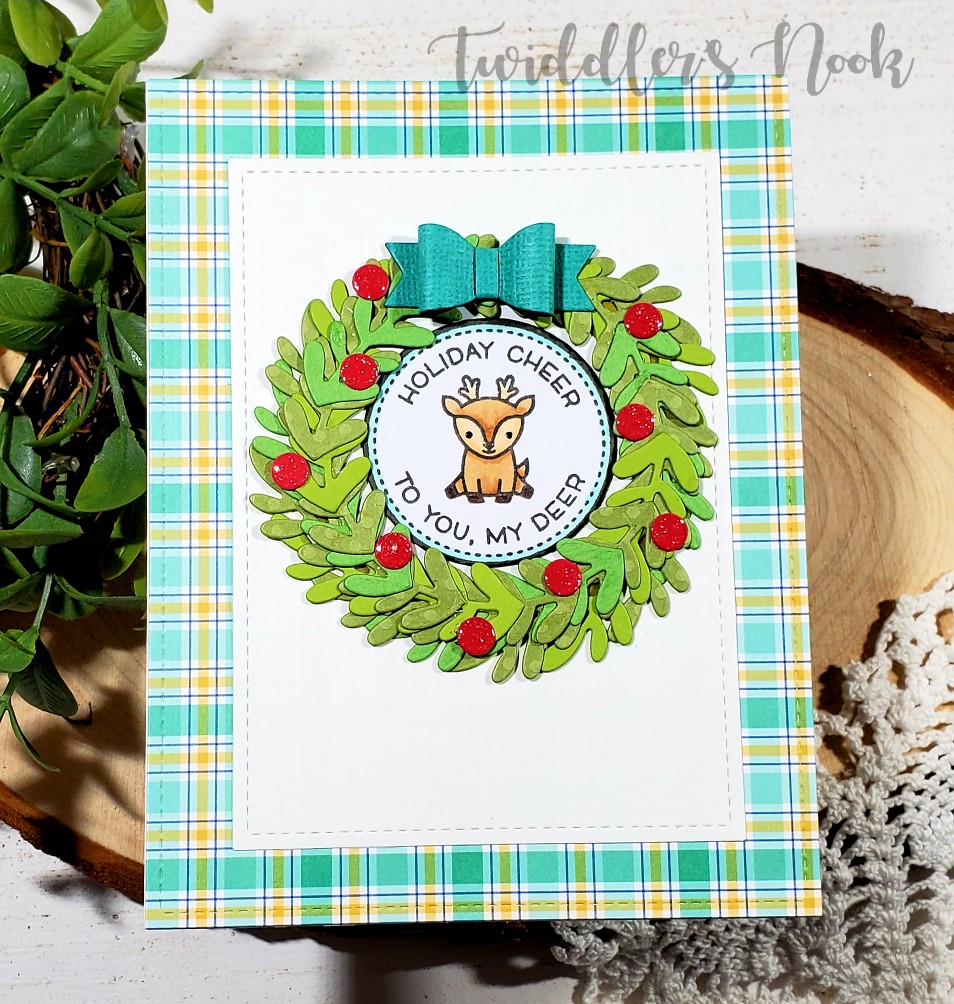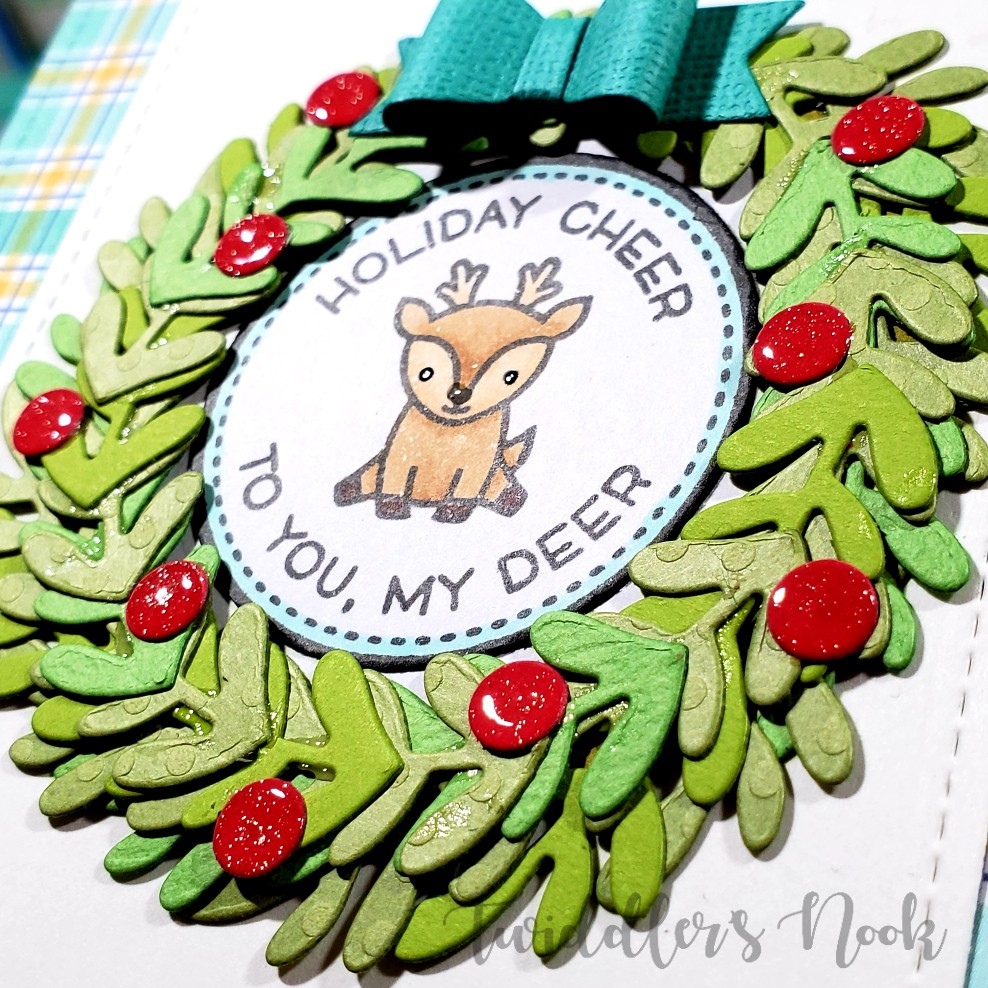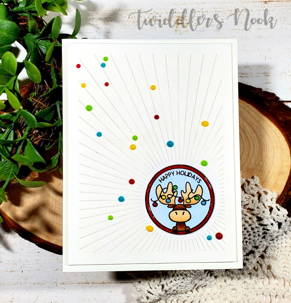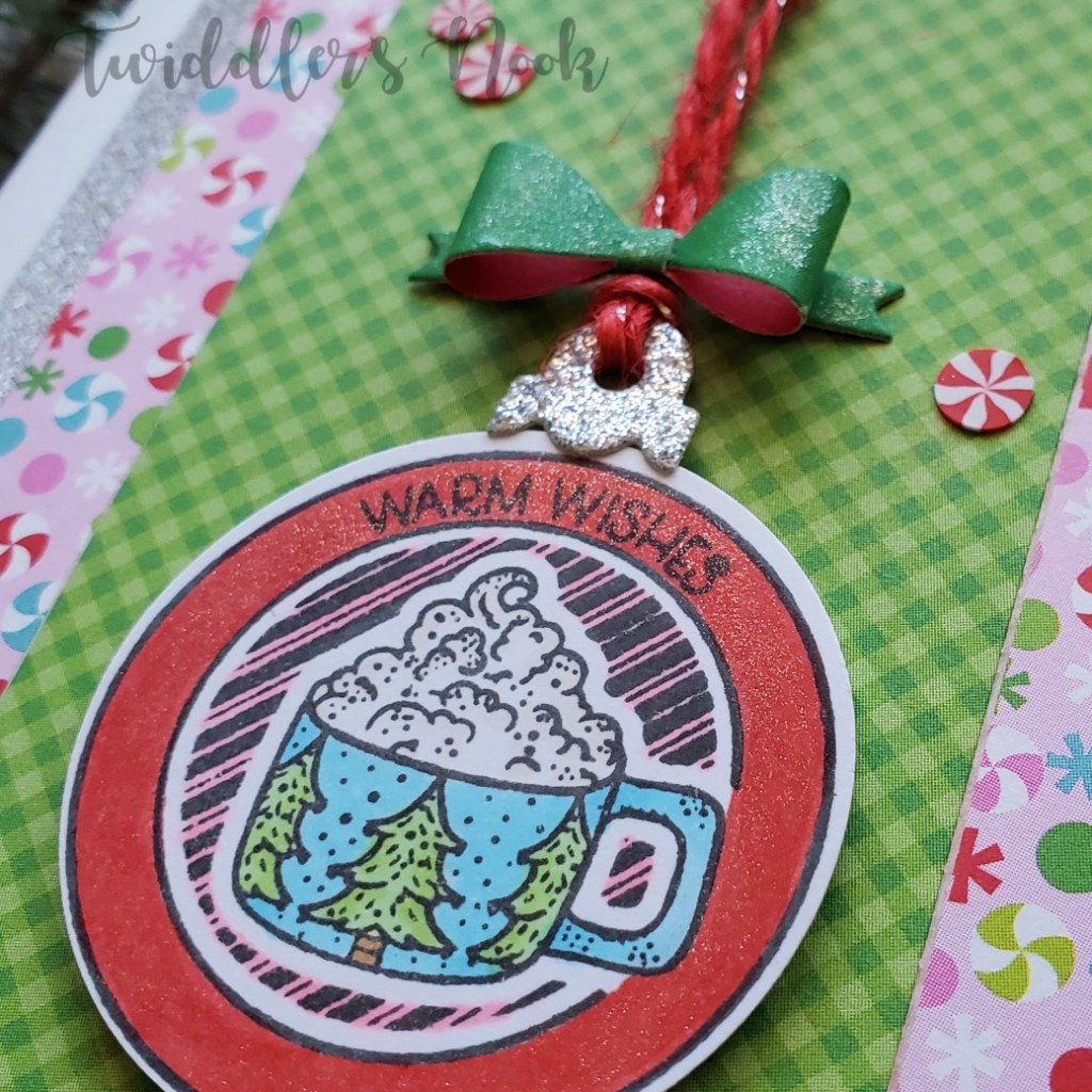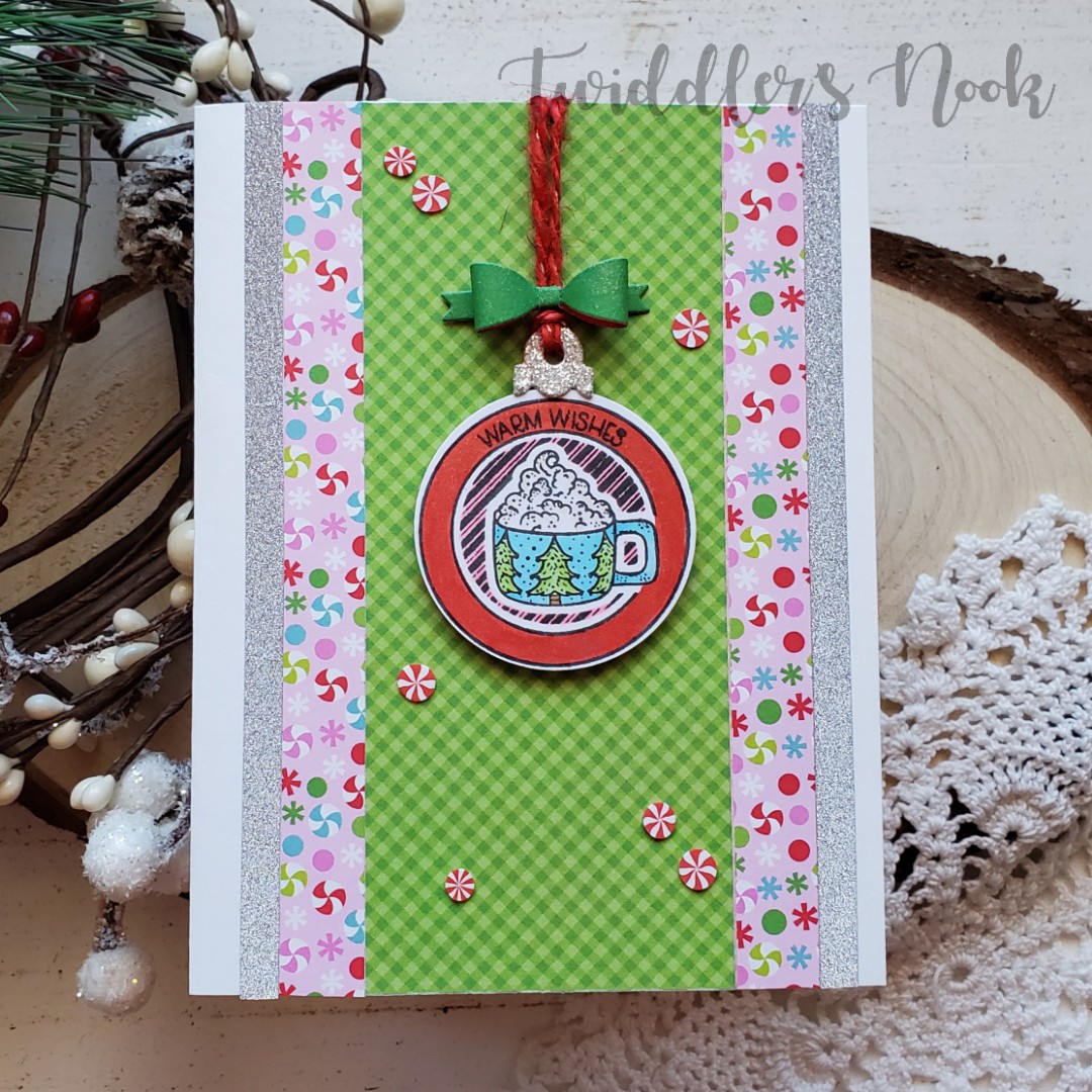 This is one of those cards that really shows how fun it can be to mix and match from different companies. We’ve got Doodlebug papers showcasing this fun Pink & Main holiday seal, with Lawn Fawn dies to turn it into a hanging ornament. Then, to finish it off, I added Trinity Stamps peppermint candy clay accents around the background.