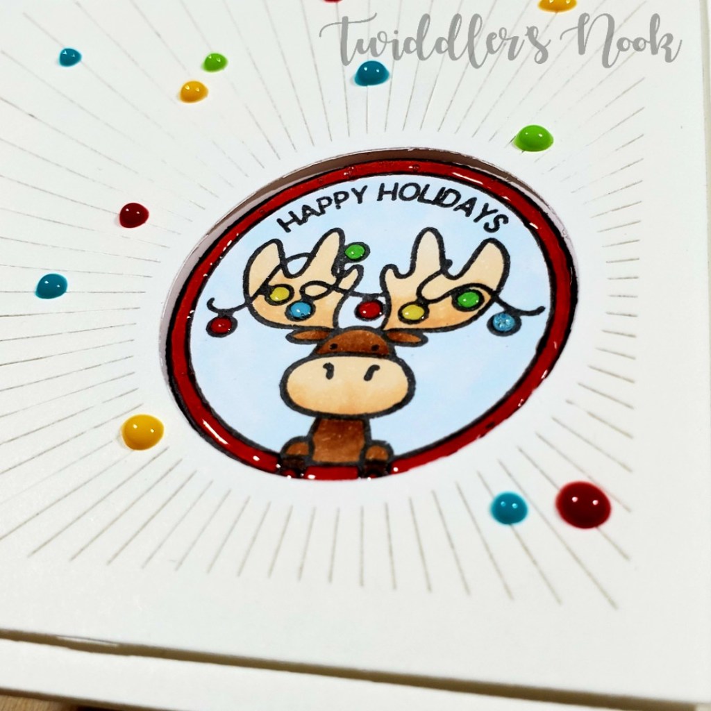 There is so much going on in this card but it’s super fun and cheery and works so well together. I did add Wink of Stella glitter brush pen to the red ring on the holiday seal and the bow for a little extra interest. I think it ties everything together with the silver glitter washi tape I added to the sides.