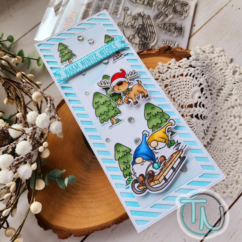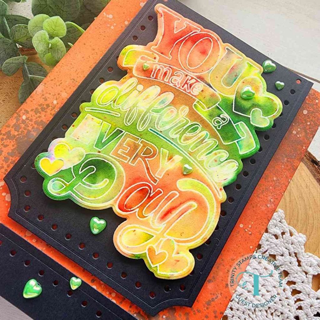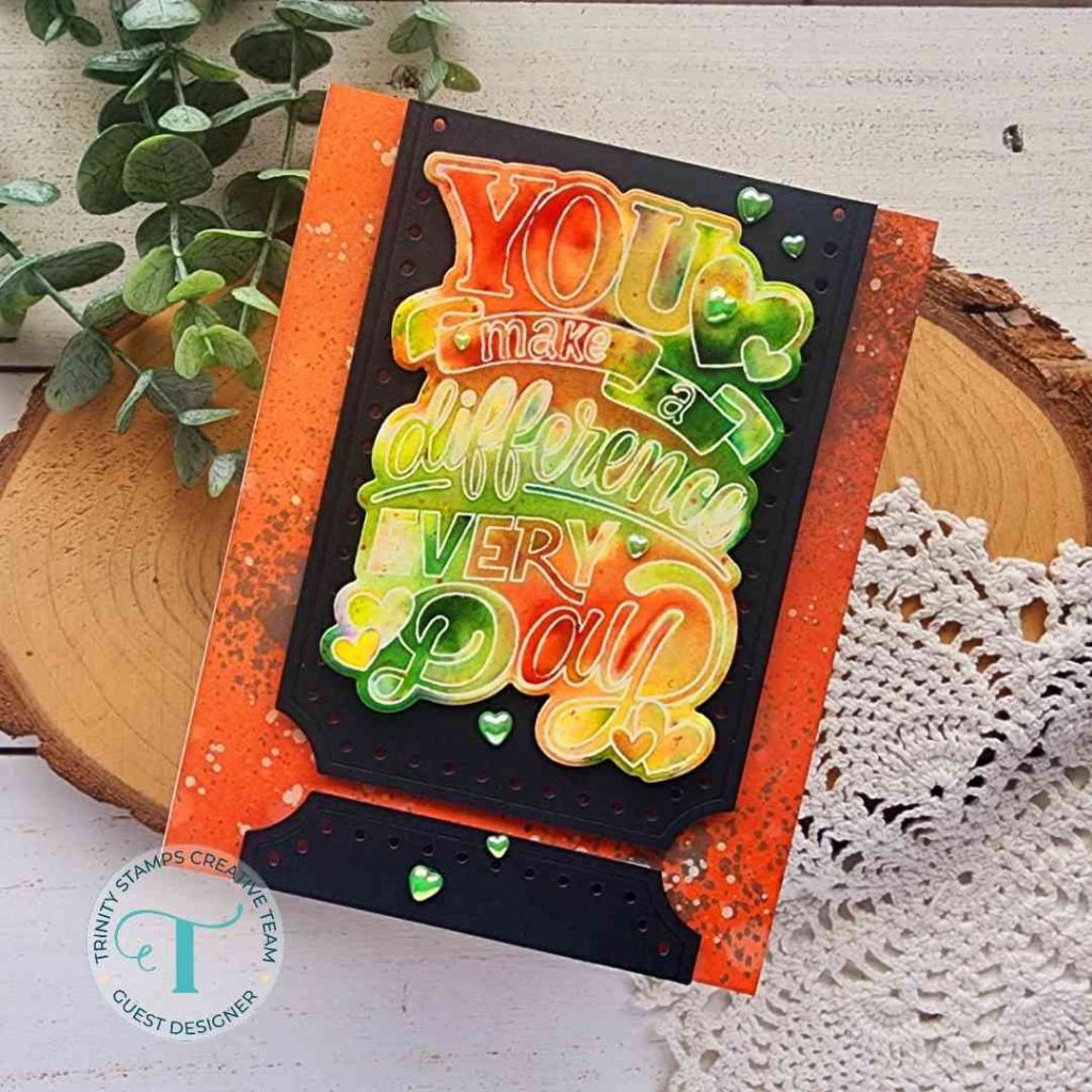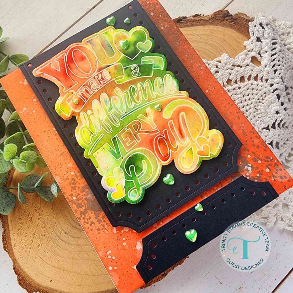 I started with the Trinity Stamps Foliage Frame Slimline die set. I just cut the frame twice – once from white cardstock and another from vellum. I layered the vellum behind and adhered the layers together. Then I ink blended another panel with Distress Oxide Ink in aged mahogany fading it as I went in to the center.