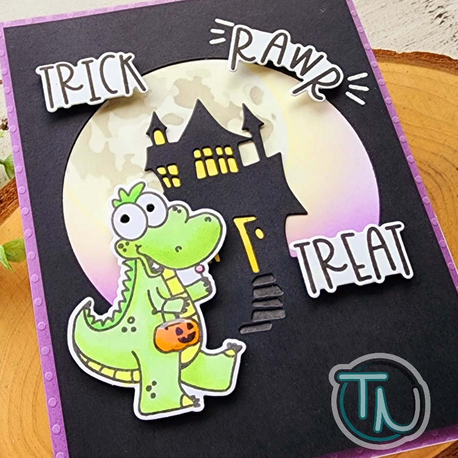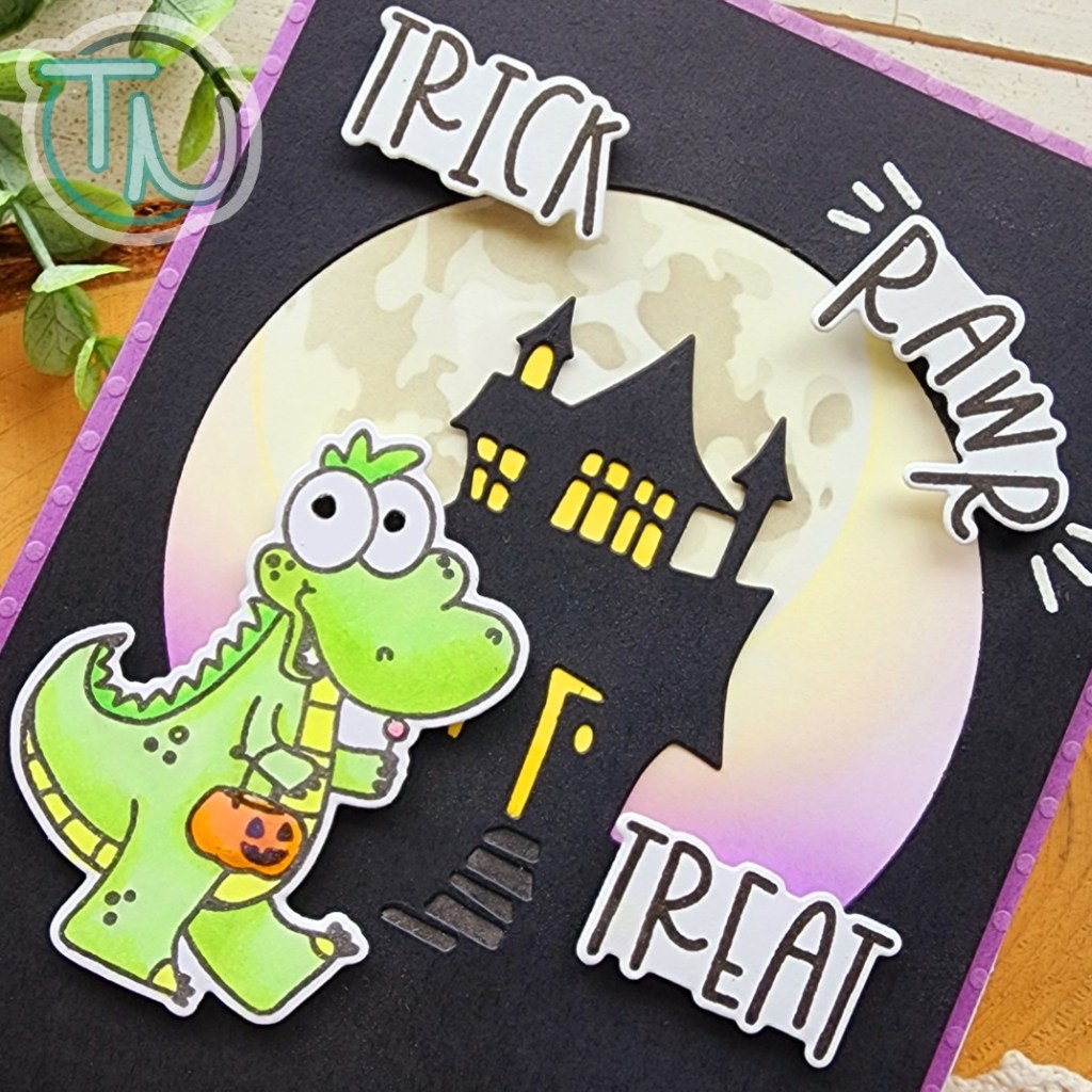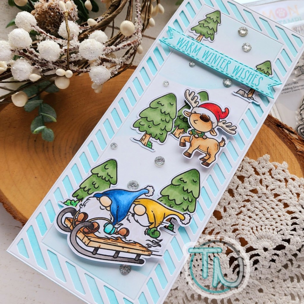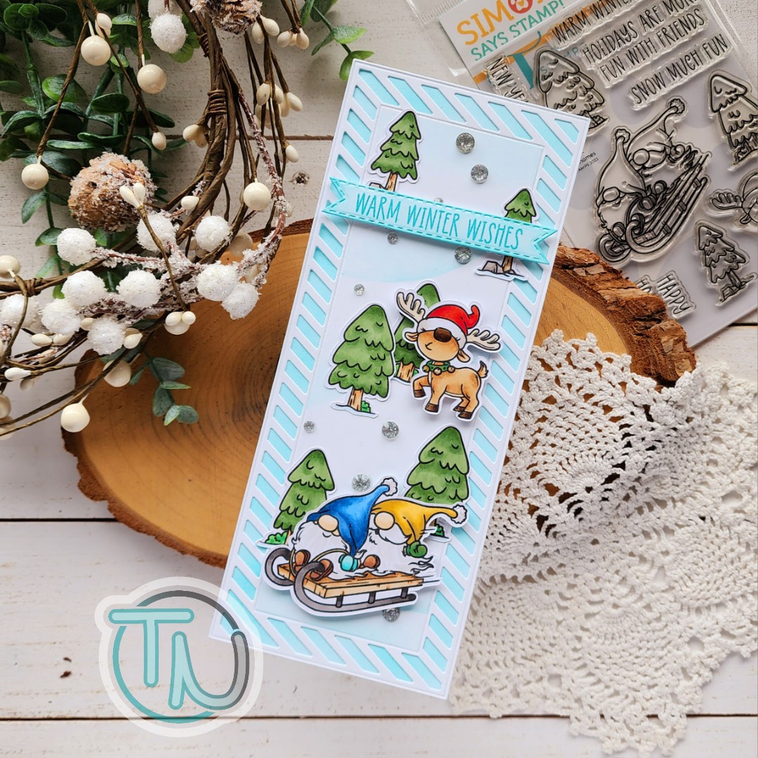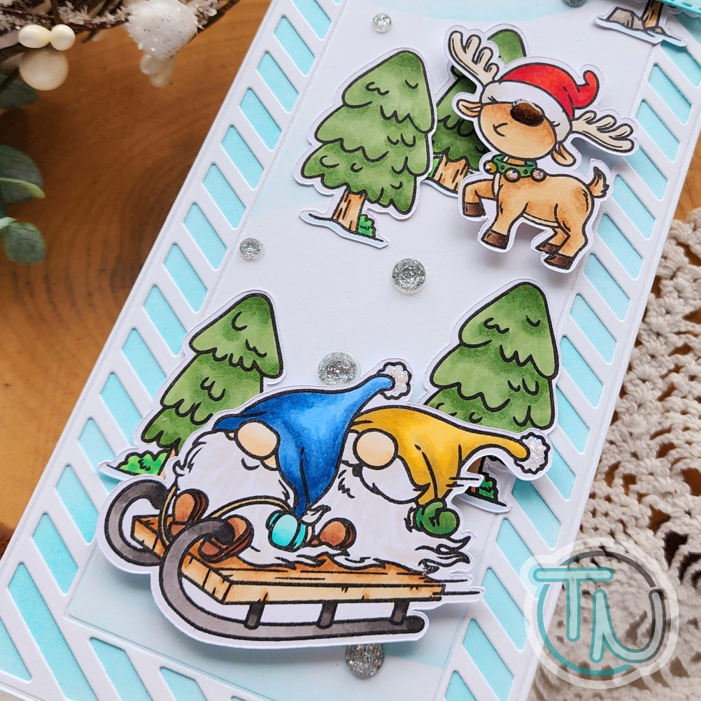 I started with the Trinity Stamps Foliage Frame Slimline die set. I just cut the frame twice – once from white cardstock and another from vellum. I layered the vellum behind and adhered the layers together. Then I ink blended another panel with Distress Oxide Ink in aged mahogany fading it as I went in to the center.