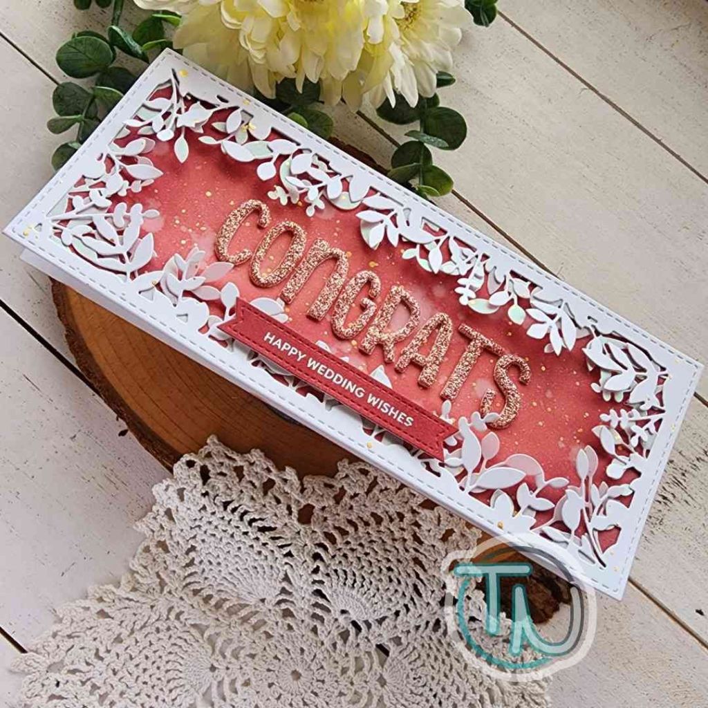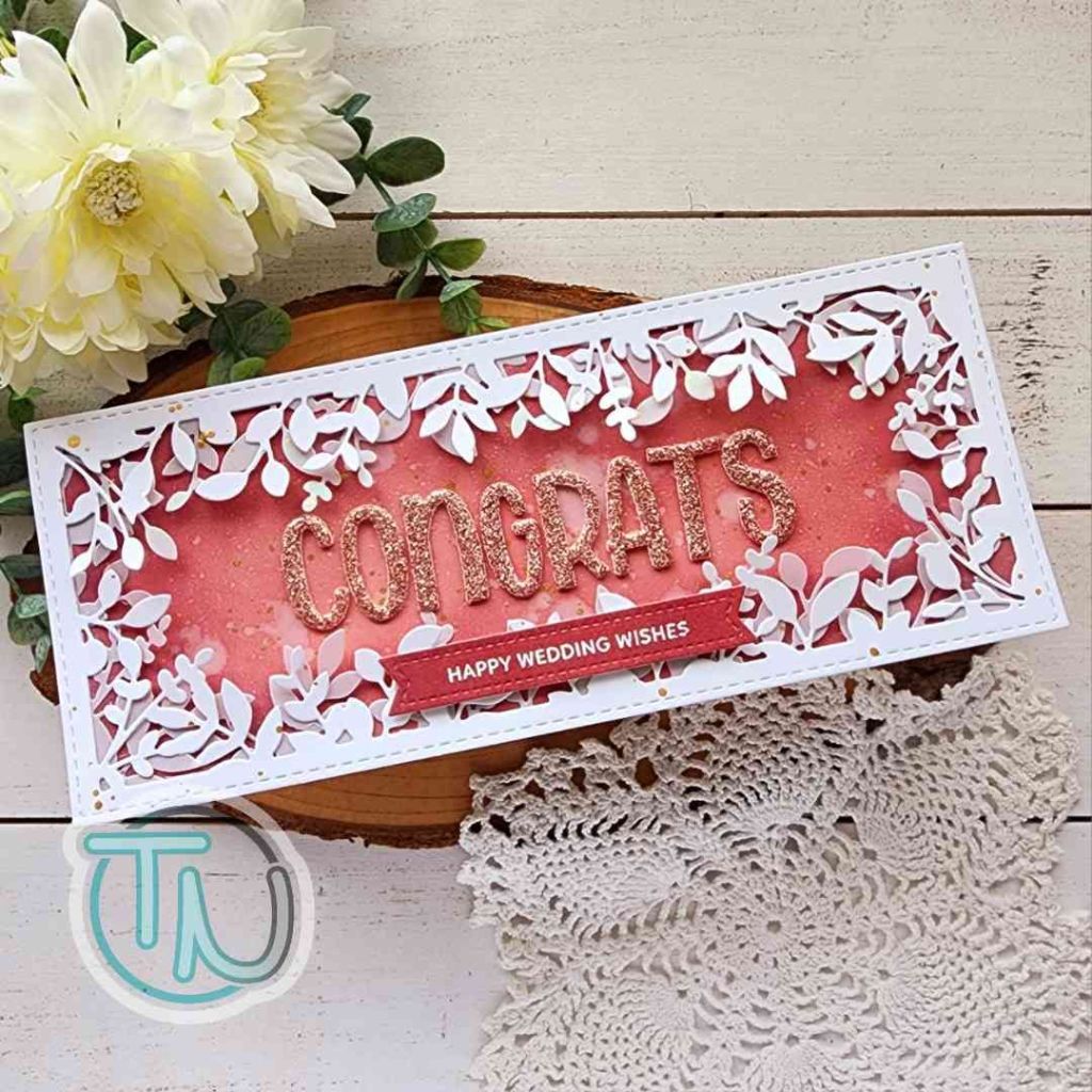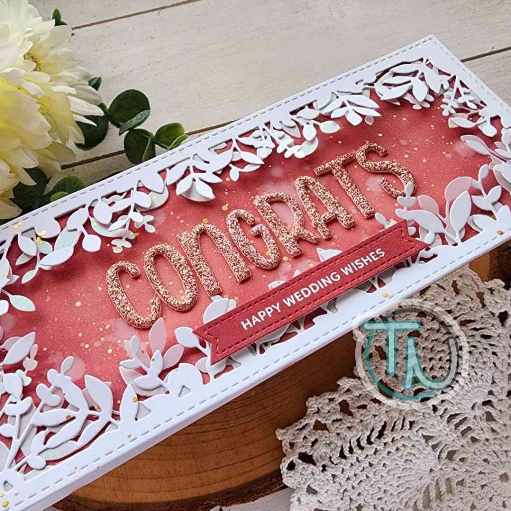 I spritzed the panel with water and blotted it dry before adhering the foliage frame to it with liquid glue. Once they were adhered together I splattered the whole thing with gold watercolor. Then I went into my stash for an alphabet set that fit inside and ended up loving the Lawn Fawn Henry’s ABCs font so I cut “CONGRATS” from Spellbinders die cutting sparkle foam in rose gold.